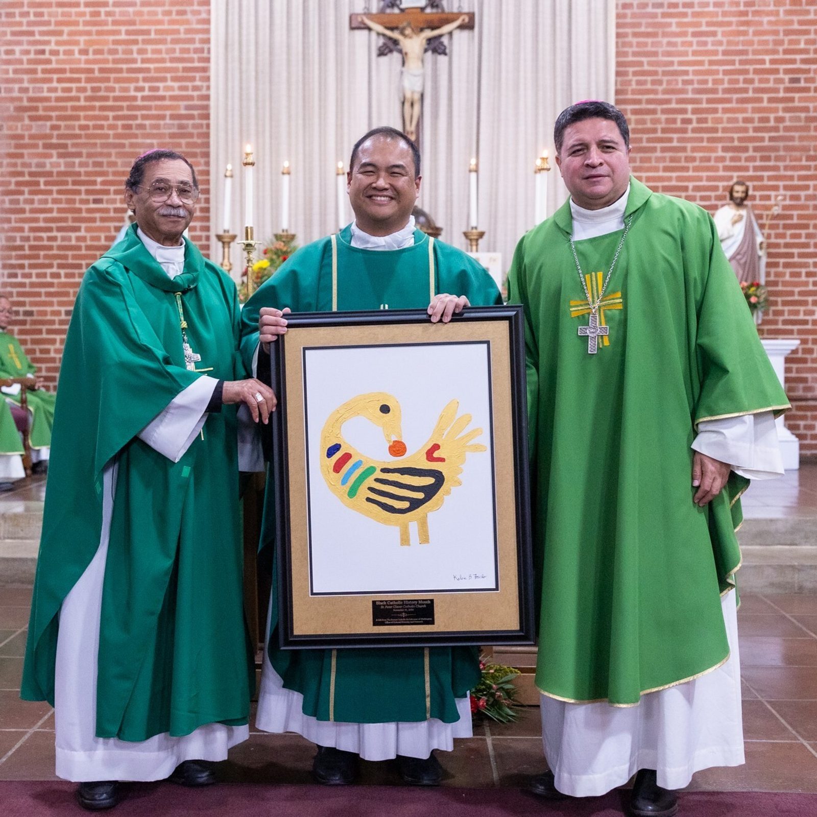 After Communion, Wendi Williams and Karen Fowler of the archdiocese’s Office of Cultural Diversity and Outreach presented Father Agustin and St. Peter Claver Parish with artwork depicting the Sankofa bird, a symbol from the Twi language of Ghana that represents looking into one’s past in order to move forward. According to a prayer card from the Office of Cultural Diversity, “the symbol honors the cultural values from African history that can provide direction and strength to move forward.”