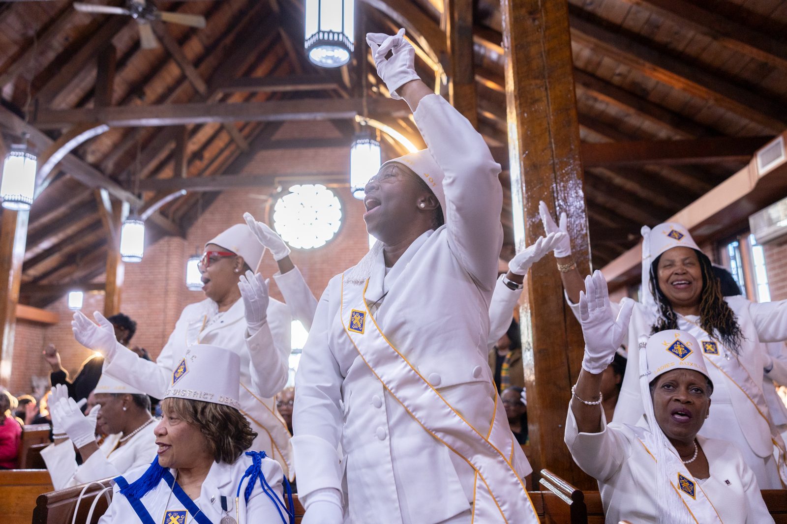 People in the congregation stood and clapped as the choir sang the stirring hymn “Total Praise” by Richard Smallwood that includes the lyrics, “You are the source of my strength, you are the strength of my life. I lift my hands in total praise to you.”