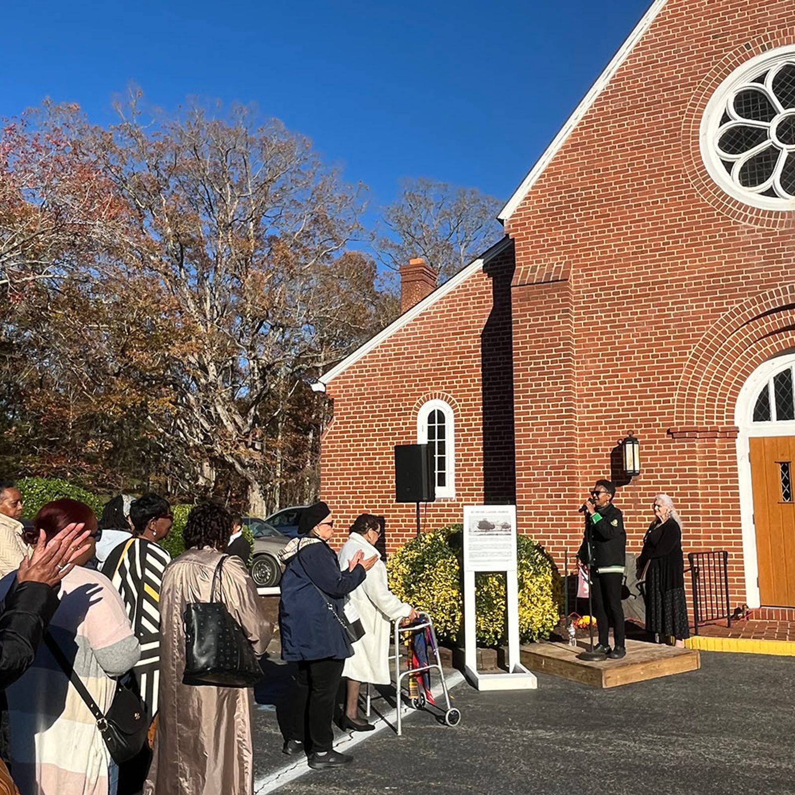 Anne Leblans – who has also been active in preserving the parish’s archives and helping to establish its museum – welcomed participants to the fifth pilgrimage stop, located down the road at the site of the parish’s former Cardinal Gibbons Institute which is now a memorial park named for that historic secondary school that served African American students from that region and from across the country.