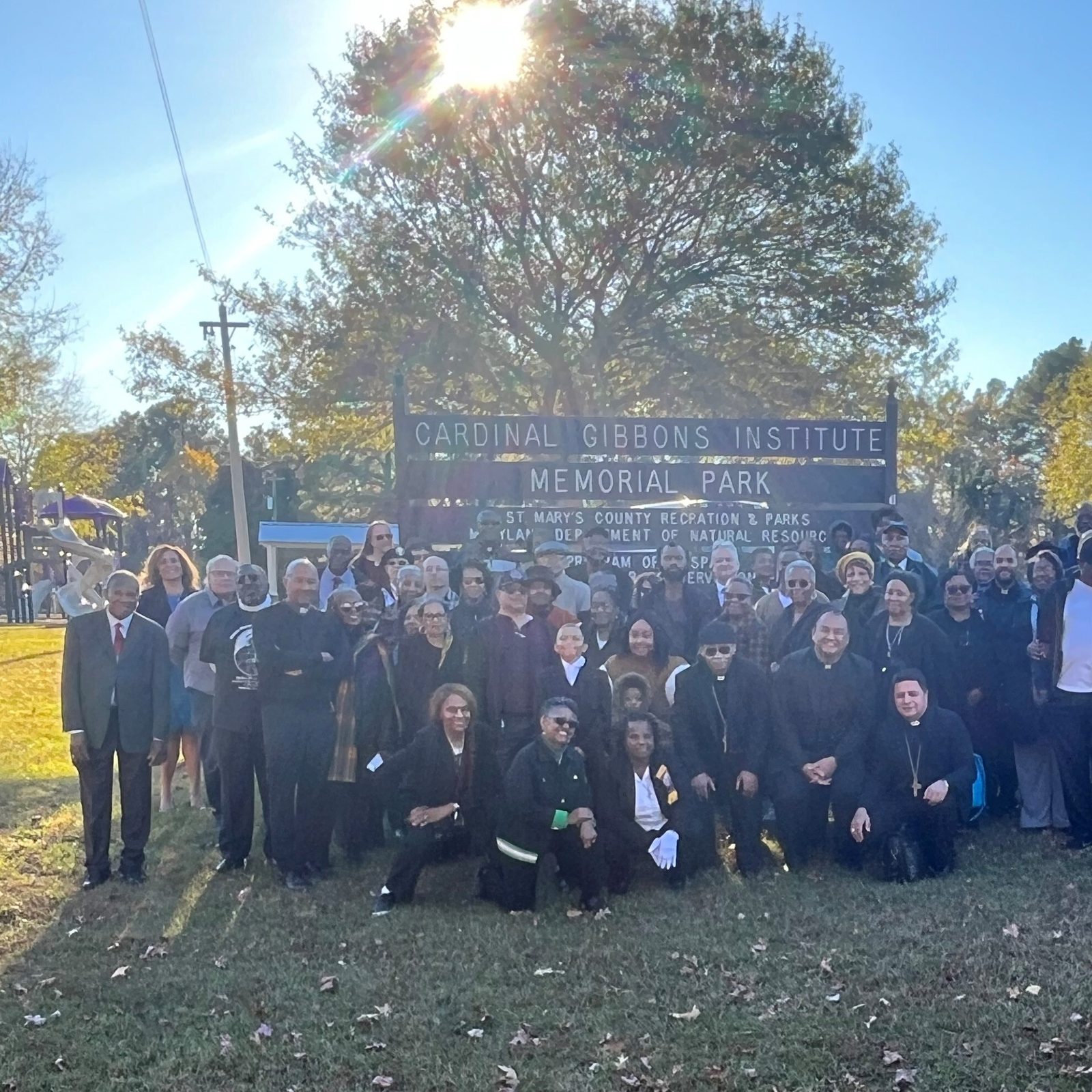 Pilgrimage participants posed for a group photo at the Cardinal Gibbons Institute Memorial Park, before proceeding to the sixth and last pilgrimage stop, at the site of the former convent for the Oblate Sisters of Providence who taught at the elementary and high schools at the St. Peter Claver Parish complex. A large photo near the altar at St. Peter Claver Church depicts Venerable Mother Mary Elizabeth Lange, who founded the Oblate Sisters of Providence in Baltimore in 1829, and whose cause for canonization is currently under consideration.