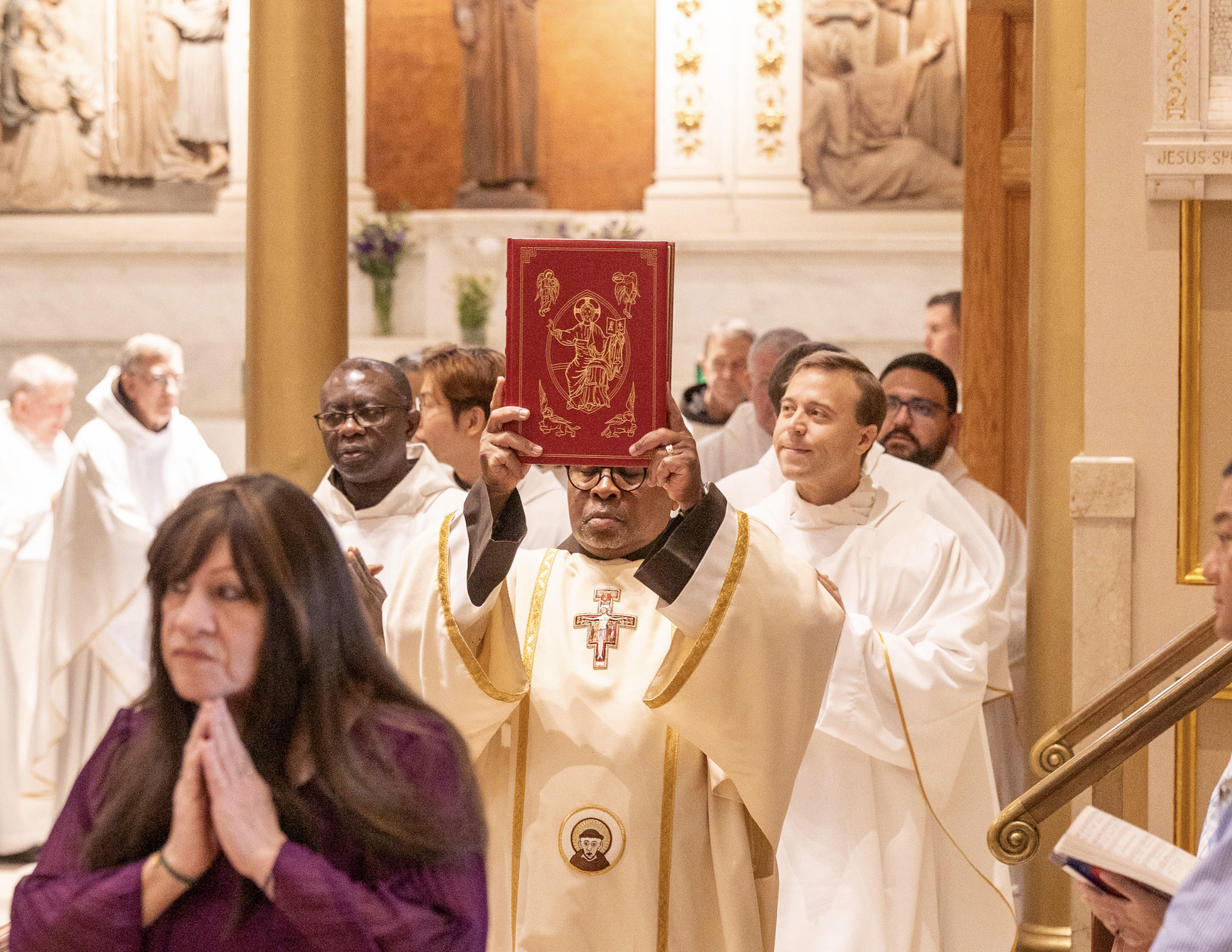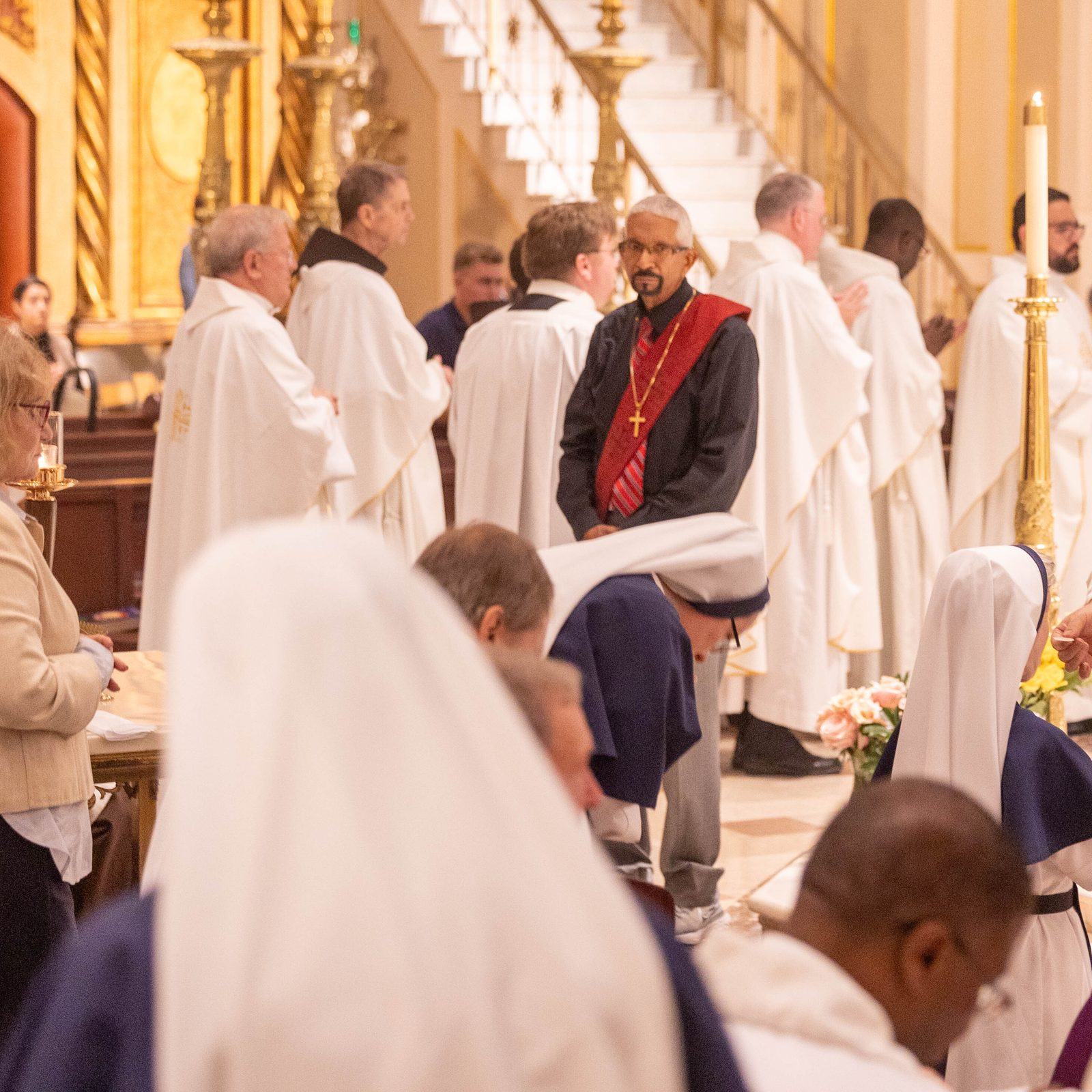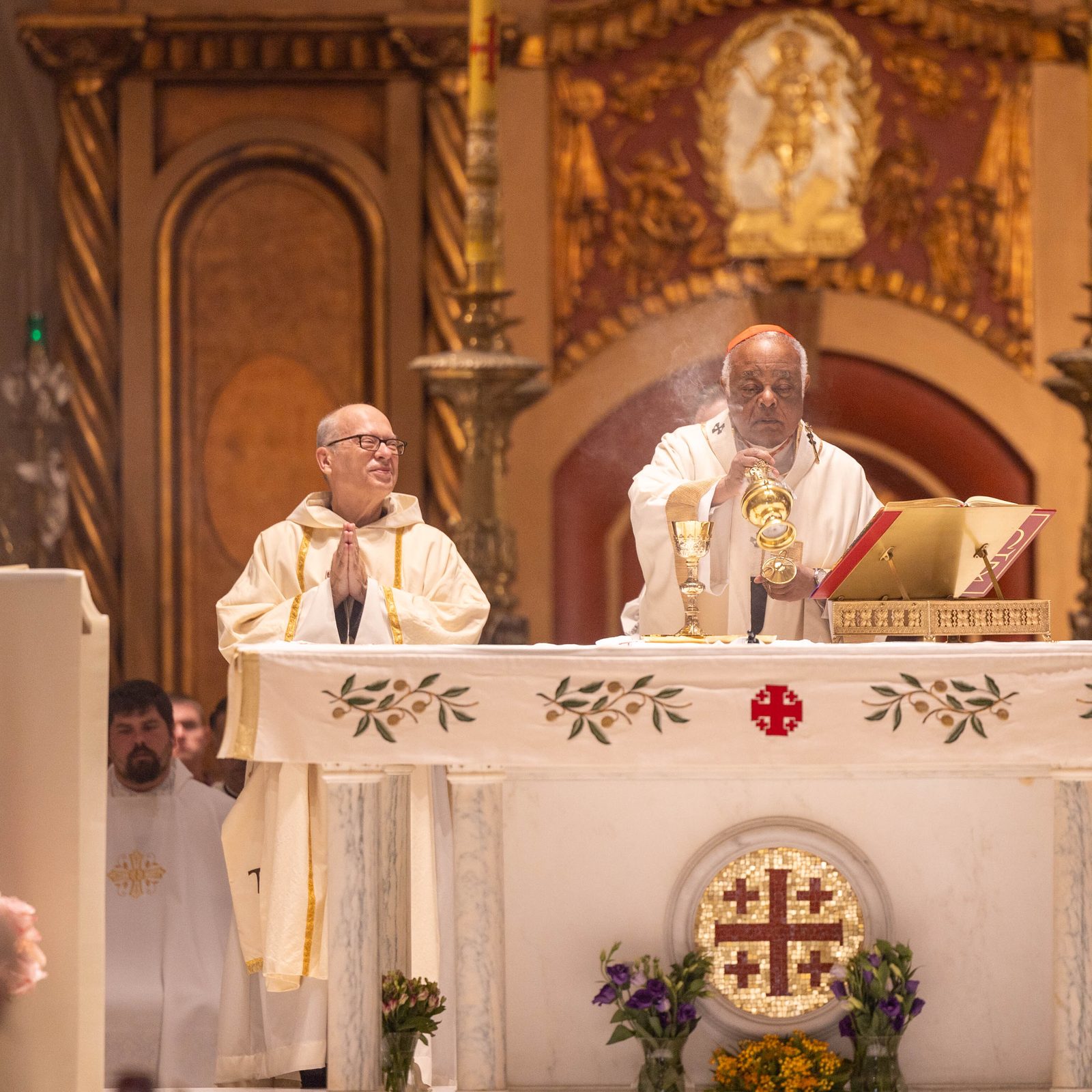 Franciscan Father Ramzi Sidawi, guardian of the Franciscan Monastery, stands near the altar as he welcomes Cardinal Wilton Gregory and the faithful to the celebration of the monastery’s 125th. (Catholic Standard photo by Mihoko Owada)