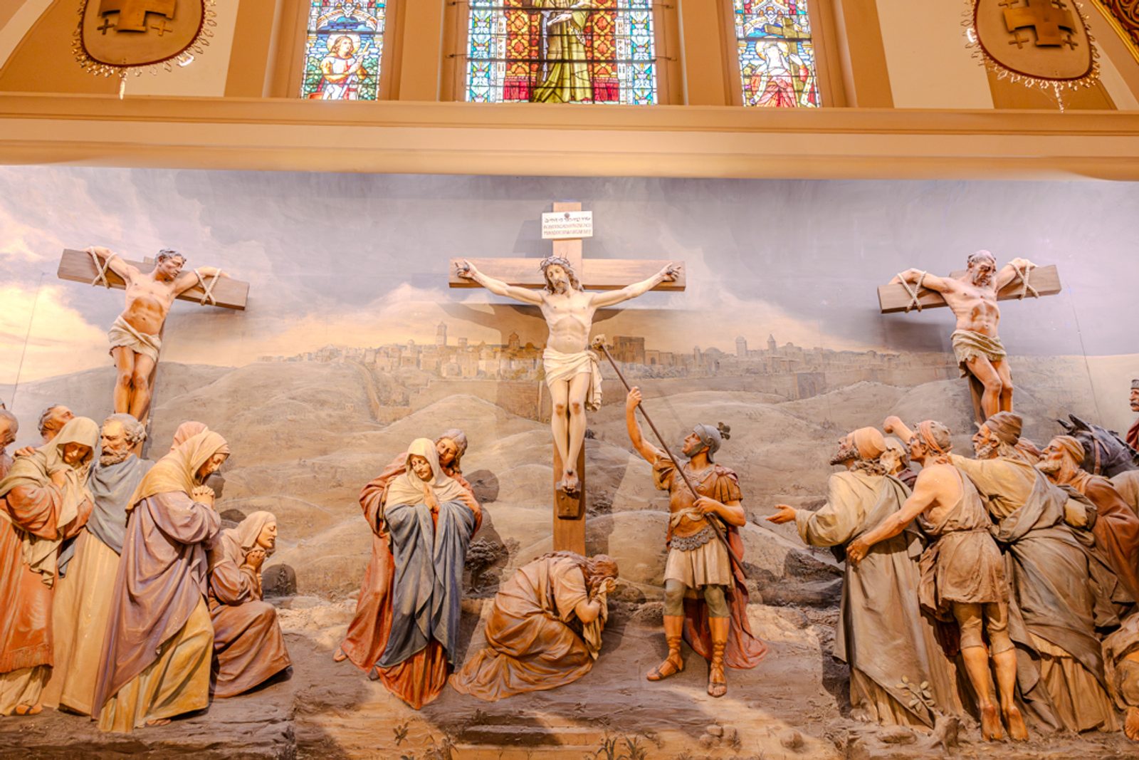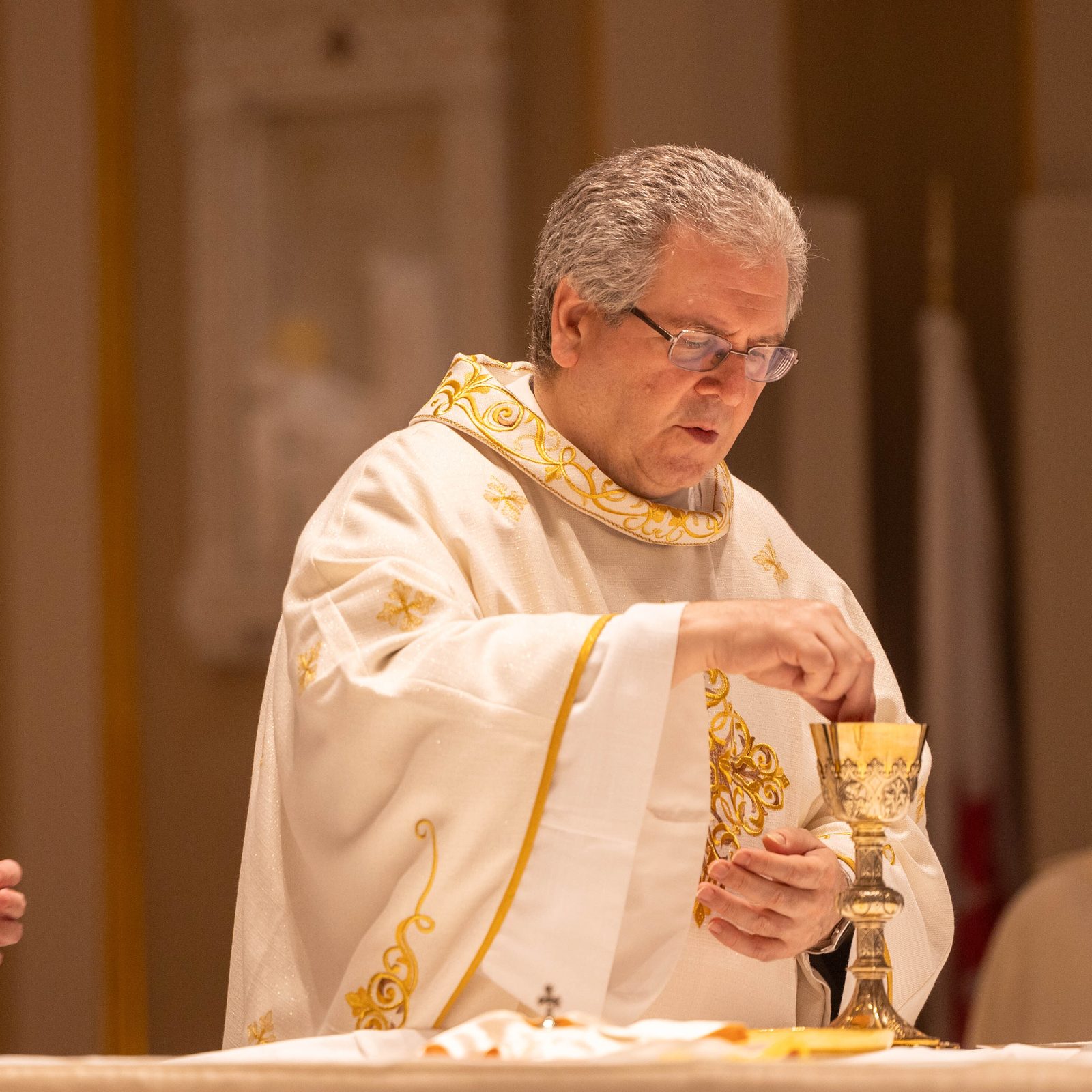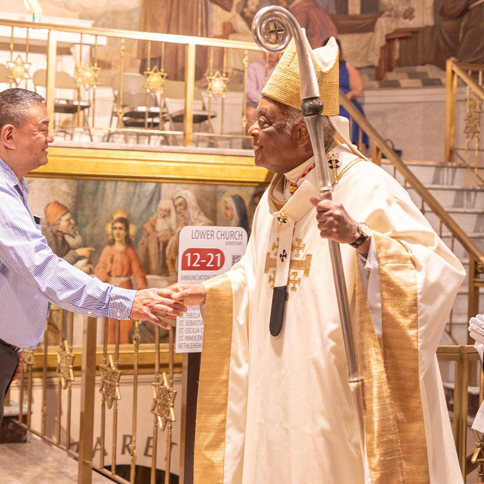 Franciscan Father Ramzi Sidawi, guardian of the Franciscan Monastery, stands near the altar as he welcomes Cardinal Wilton Gregory and the faithful to the celebration of the monastery’s 125th. (Catholic Standard photo by Mihoko Owada)