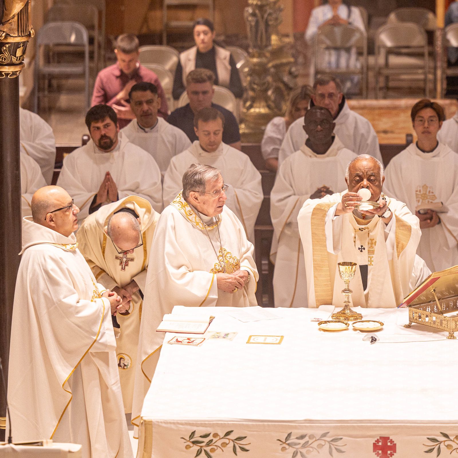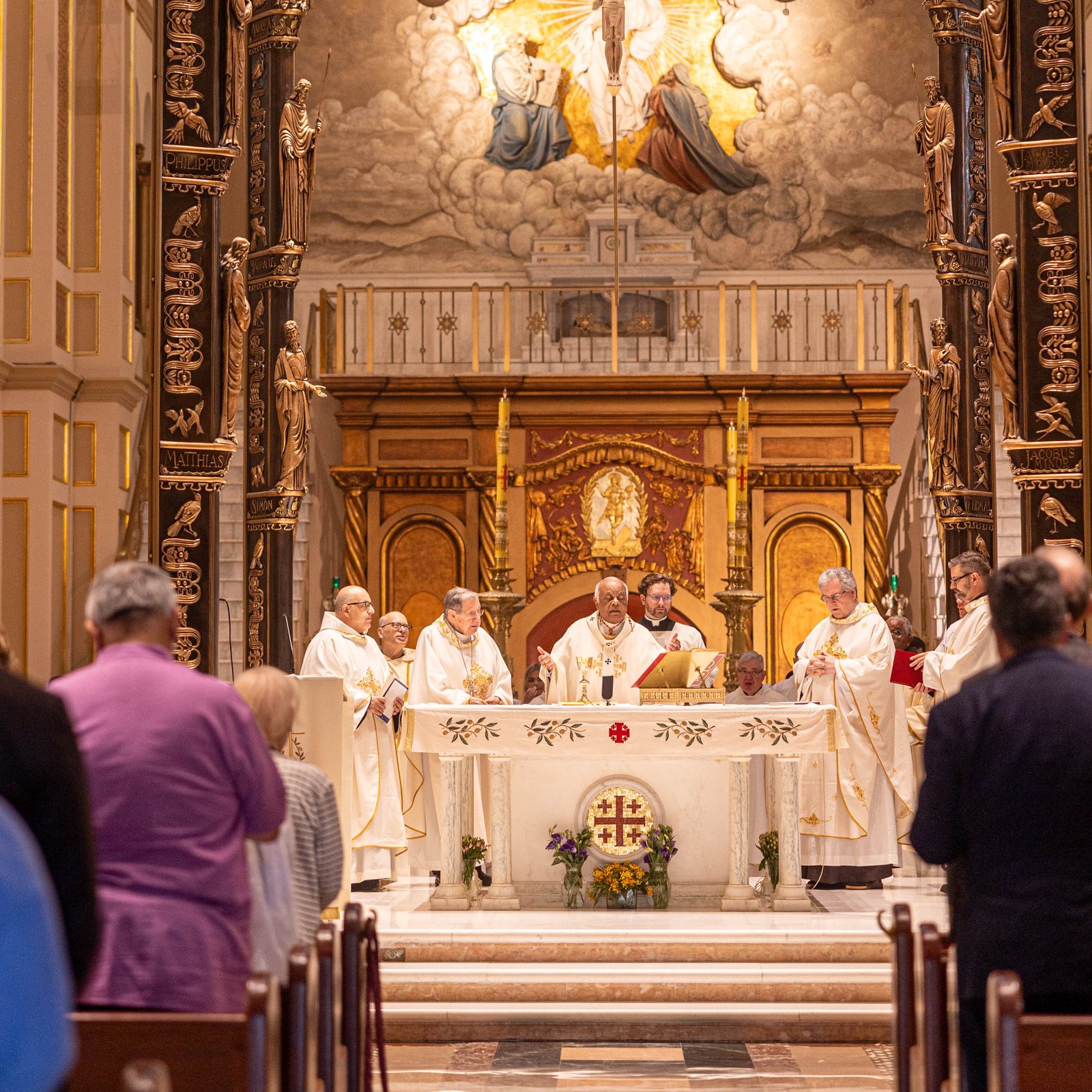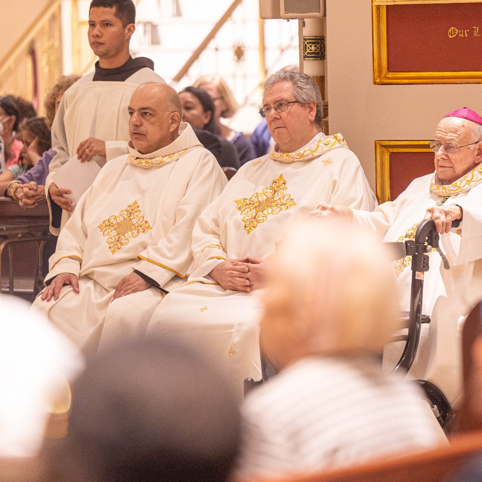 Concelebrating the Mass with Cardinal Gregory were (from left) Franciscan Father Ramzi Sidawi, guardian of the monastery; Franciscan Father Francesco Patton, the Custos of the Holy Land and guardian of the Holy Shrines of Christianity; Bishop Paul Loverde, the bishop emeritus of Arlington, Virginia, and Bishop Denis Madden auxiliary bishop emeritus of Baltimore, both of whom serve as co-chairmen of the monastery’s honorary board of directors. (Catholic Standard photo by Mihoko Owada)