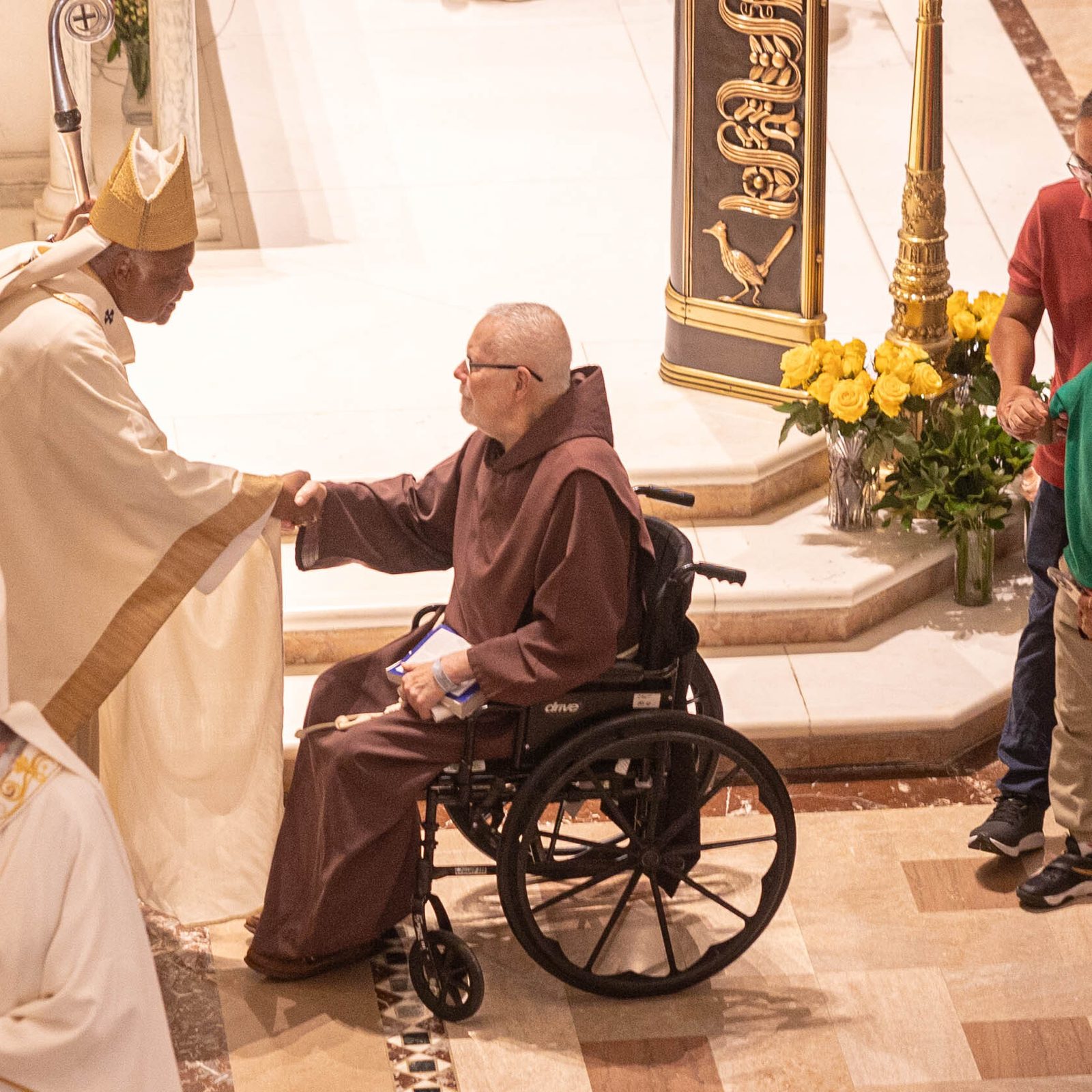 Franciscan Father Francesco Patton, the Custos of the Holy Land and guardian of the Holy Shrines of Christianity, distributes Holy Communion during the anniversary Mass at the Franciscan Monastery.(Catholic Standard photos by Mihoko Owada)