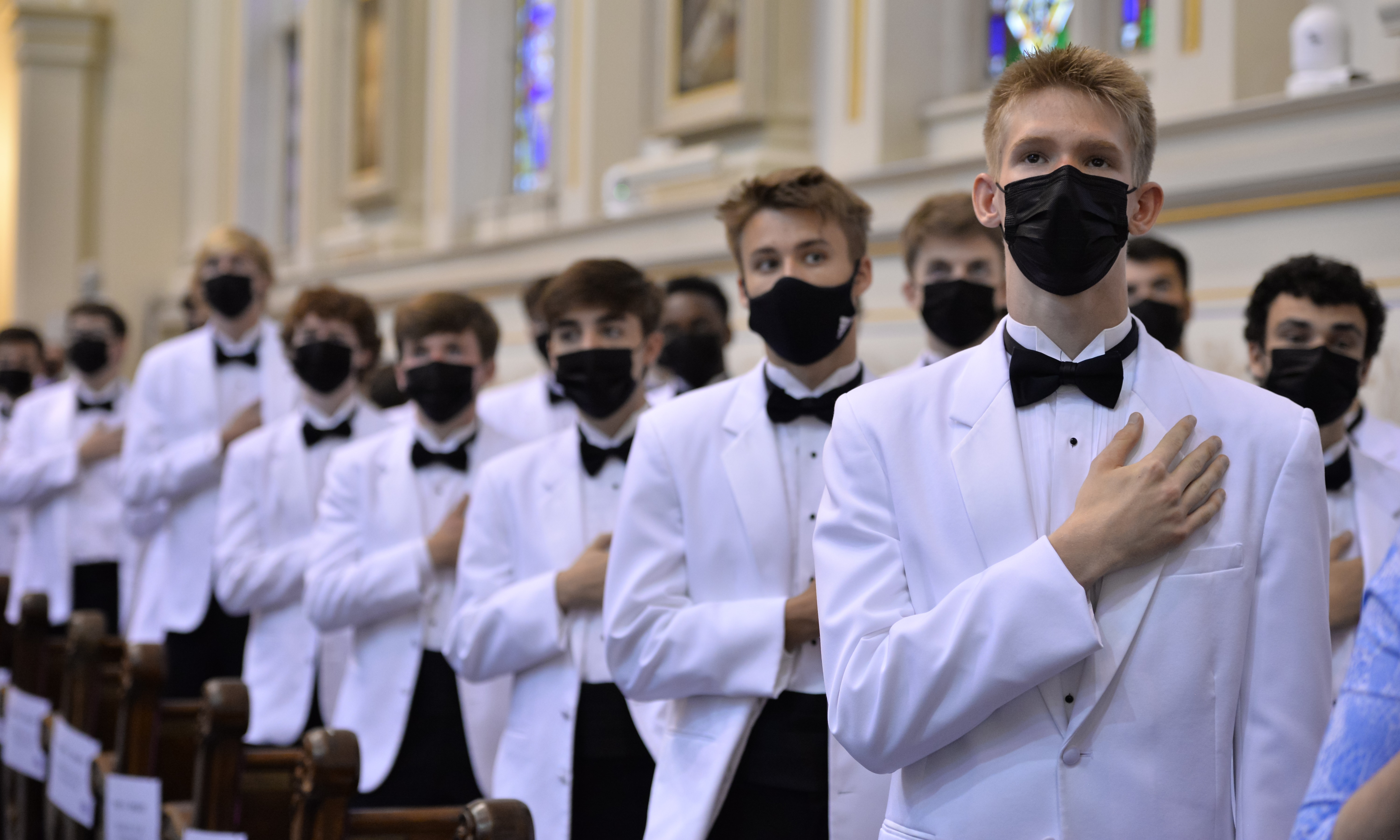 The pews and chairs set on the altar area of St. Aloysius Church were filled with faculty and alumni, with the guests masked but not sitting at a distance from each other. The graduates wore identical white suit coats with black pants, ties and face masks. Several traditional elements of graduation ceremonies that had been curtailed for pandemic precautions were back: singing, playing musical instruments and congratulatory handshakes.
