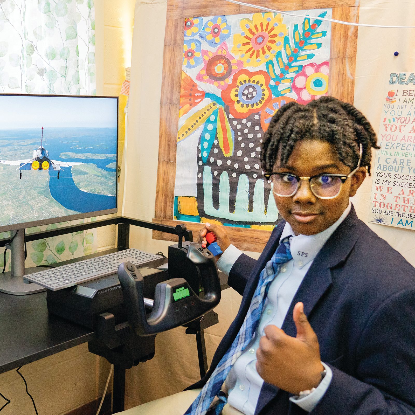 Meanwhile, Laila Mills, a St. Peter’s eighth grade student with aspirations to attend St. Mary’s Ryken High School in Leonardtown and focus on computer science, is particularly drawn to the technical aspects of the program. She enjoys the challenge of learning to operate the flight simulation controls, which allows her to combine her interest in technology with her growing passion for computer science.