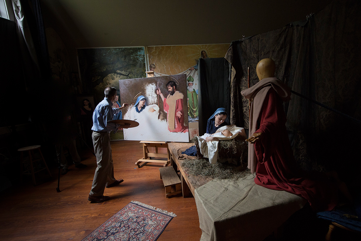 The high window’s light falls down on a scene of the Nativity. The model posing as Mary cradles a baby-doll Jesus in the manger. The work is for the third of five paintings of the Joyful Mysteries of the Rosary that Wingate is painting for St. Mary Mother of God Church. Today Wingate depicts “the true light that enlightens every man” (John 1:9). He depicts the rosier skin tone of his model’s face, trying to capture the tender expression of the Blessed Mother as she gazes on her human and divine Son, blending the lines of her neck into shadow.