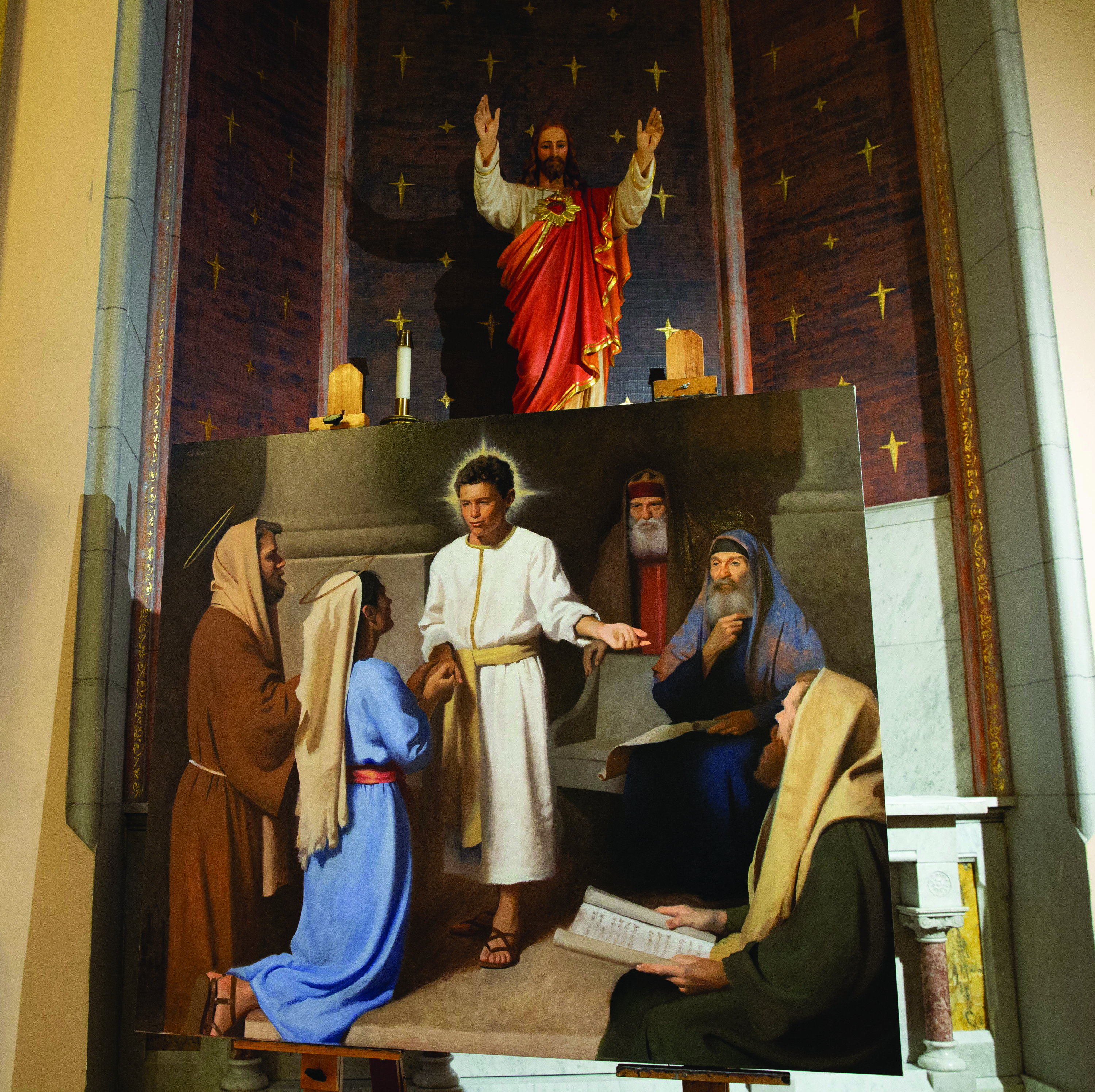 Local Virginia portrait and religious artist Henry Wingate recently completed the final painting, “The Finding of the Child Jesus in the Temple,” for a set of the five Joyful Mysteries of the Rosary that the parish commissioned him to create to adorn the sanctuary. After a solemn High Mass in the Extraordinary Form for the feast of the Assumption, Father Vincent De Rosa, parochial administrator of St. Mary Mother of God, blessed the new painting with incense.