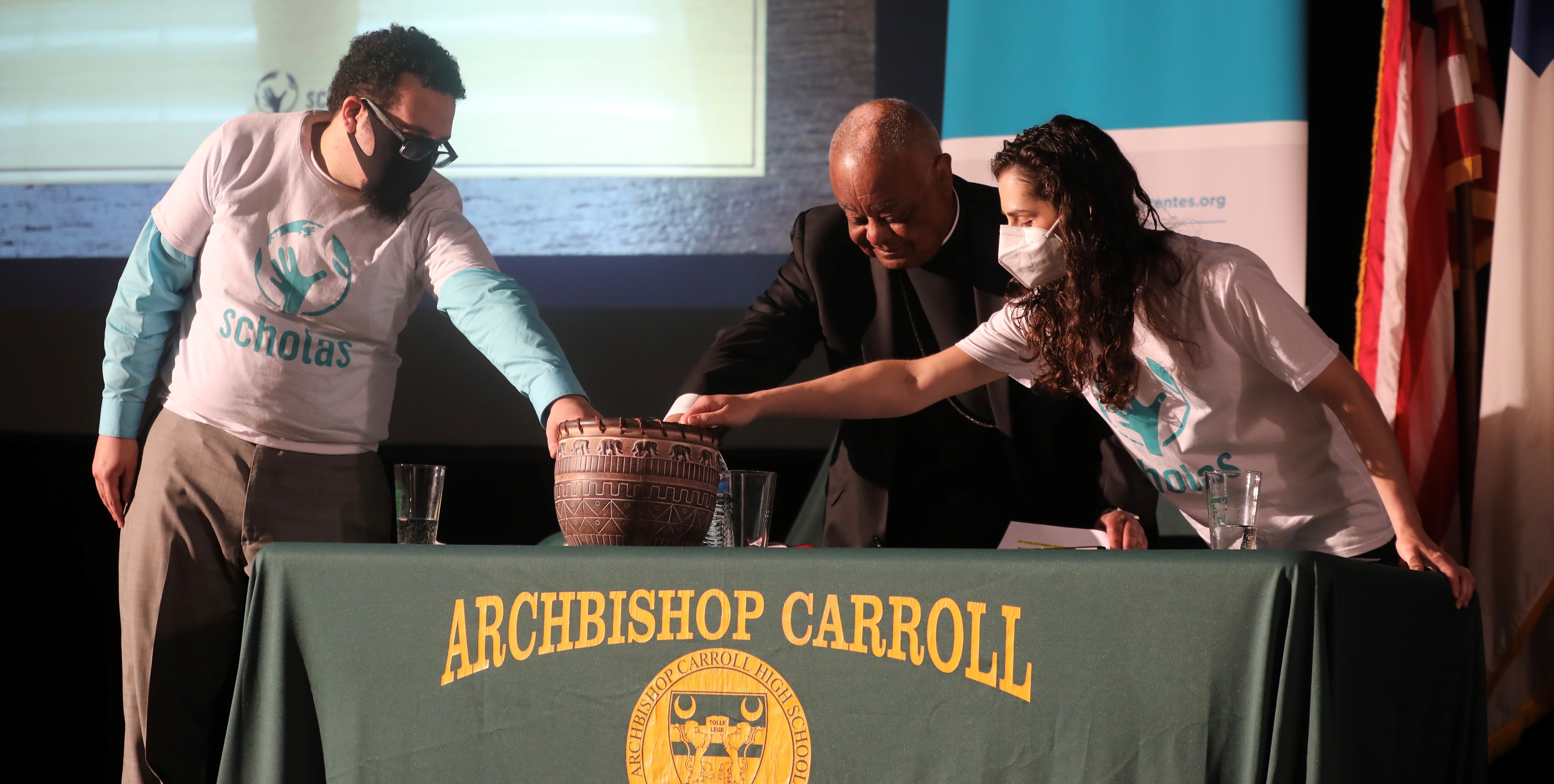For the excited students in the Archbishop Carroll audience, their interaction with the rest of the global participants ended up being mostly one-sided, as technical problems in Rome interfered with the video link just as Washington Cardinal Wilton Gregory began speaking and the students started cheering. Cardinal Gregory, the audience and two young adults speaking about their aspirations for Scholas Occurrentes in their communities later recorded their participation to be sent to the Scholas organization and the Vatican.