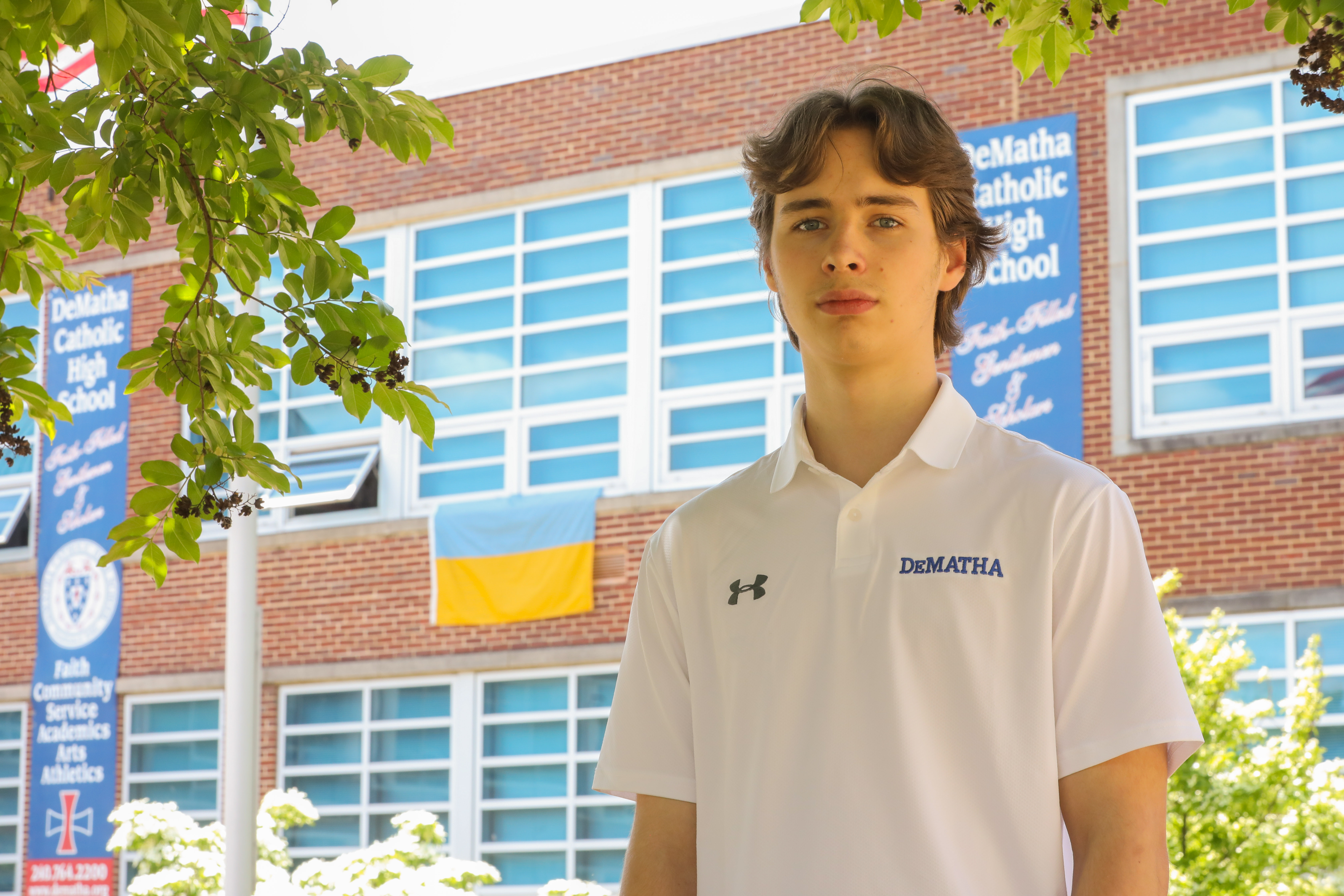 Sitting at a picnic table on a mild spring afternoon, the student wore a white DeMatha polo shirt and had a free period after taking a geometry test earlier that day. Nearby, displayed on the outside of DeMatha’s main building were two banners noting the school’s “Faith-Filled Gentlemen and Scholars” and its hallmarks of faith, community service, academics, arts and athletics. And displayed on the wall in between the banners was a large blue and yellow Ukrainian flag.