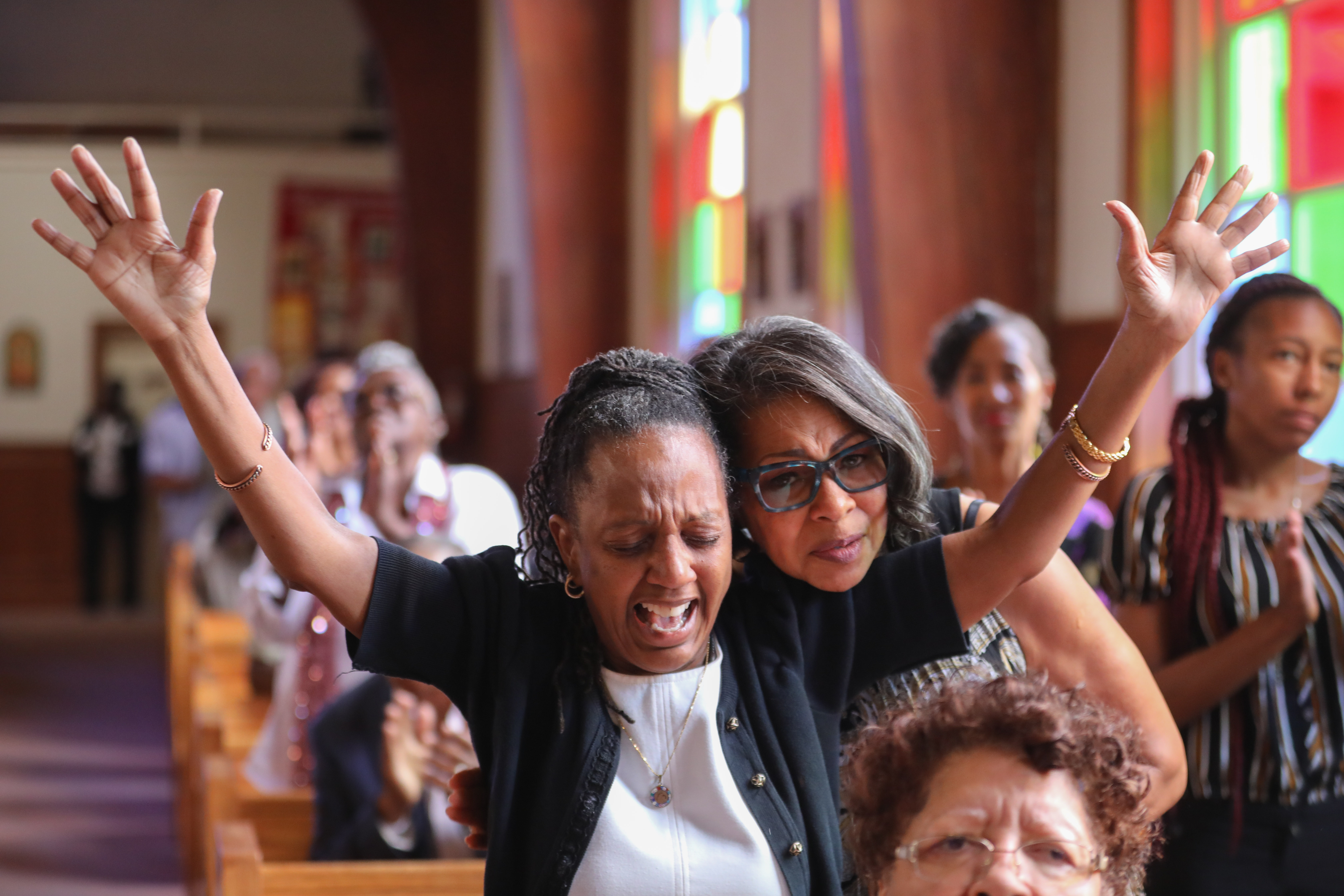 Women pray during an Aug. 4 Mass celebrated by Washington Archbishop Wilton Gregory at St. Thomas More Church in the nation's capital. In the photo below, Archbishop Gregory presides at the Mass, joined at left by Deacon Keith Somerville and at right by Father Raymond Moore, the pastor there. That weekend, the archbishop also celebrated Mass at Our Lady Star of the Sea Parish in Solomons, Maryland. The remaining photos in this gallery show a variety of scenes from the archbishop's Mass at St. Thomas More Church. (CS photos/Andrew Biraj)