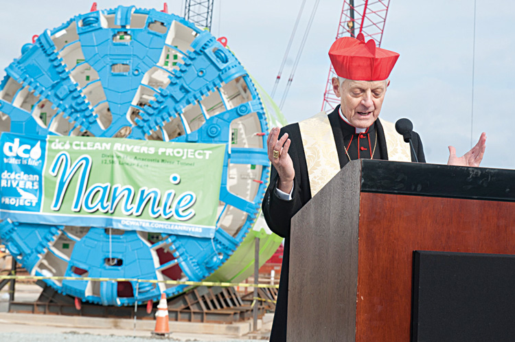 DC Water has a vision of a cleaner Anacostia River— teeming with wildlife and surrounded by people enjoying nature. The new giant tunnel boring machine “Nannie,” blessed by Cardinal Wuerl at a ceremony on Dec. 12, will help make that dream a reality by eliminating 98 percent of sewer overflows to the river. At the christening outside of RFK Stadium, DC Water employees, contractors and community members gathered to see the bright blue and green machine that will soon move 6.5 million cubic feet of soil and tunnel around 52 to 64 feet per day. “I sit here and I look at Nannie so beautifully painted and I know from experience that this is the last time she’s going to look that good,” said Kenneth J. Kopocis of the Environmental Protection Agency, “but the reason she won’t look that good is because of the tremendous work she’s going to do to help the Anacostia River.” George S. Hawkins, the CEO and general manager of DC Water, explained that the 560 ton machine will be dropped 10 stories underground to create a tunnel that will eventually meet up with tunnel boring machine Ladybird near the Nationals Ballpark. Then the two billion gallons of rainfall and sewage that now go into the Anacostia will instead be conveyed via the tunnel to a wastewater treatment plant. The project is scheduled to be completed in 2025, but some parts of Anacostia will benefit from the project by 2018. Ward 7 resident Dennis Chestnut expressed his gratitude at the project because of his lifelong connection to the body of water. “The Anacostia River is where I learned to how swim as a child and my children couldn’t benefit from the same experience I had,” he said. As executive director of Groundwork Anacostia River, he wants that to change. “I’ve committed myself to restoring the health of the Anacostia River, and I’m so excited about the Nannie because this is going to make a tremendous difference in achieving that goal,” said Chestnut. Postponed due to Marion Barry’s funeral, the ceremony was originally scheduled on the feast day of St. Barbara, the patron saint of miners and tunnelers. “I’m told by those who do this work that none of these drillings take place without St. Barbara placed somewhere protectively watching over everyone,” said Cardinal Wuerl, who blessed a St. Barbara medal and statue along with Nannie. “Today we’re simply going to ask a blessing on the work of this great machine, but more importantly, God’s protective blessing on all those who do the work,” he said. The cardinal thanked many of the neon-vested and hard-hat clad DC Water employees for their hard and important work, while also joking with them, saying, “I wore my hard hat too,” pointing to his red biretta. After the prayer, workers took pictures in front of Nannie along with DC Water mascot Wendy the Water Drop. The tunnel boring machine was named after Nannie Helen Burroughs, a 20th century African American educator who worked near the Anacostia River and founded the National Training School for Women and Girls. Nannie the machine will also be an educator in its role with Phelps Architecture, Construction and Engineering High School in Washington, which has adopted the machine in a partnership with DC Water. “It’s real-world connection to what they’re learning in the classes,” said director Olatundun Teyibo, who attended the ceremony with her students. “We will be able to come out and visit, and (the engineers) will come inside the school and offer in-class support.”