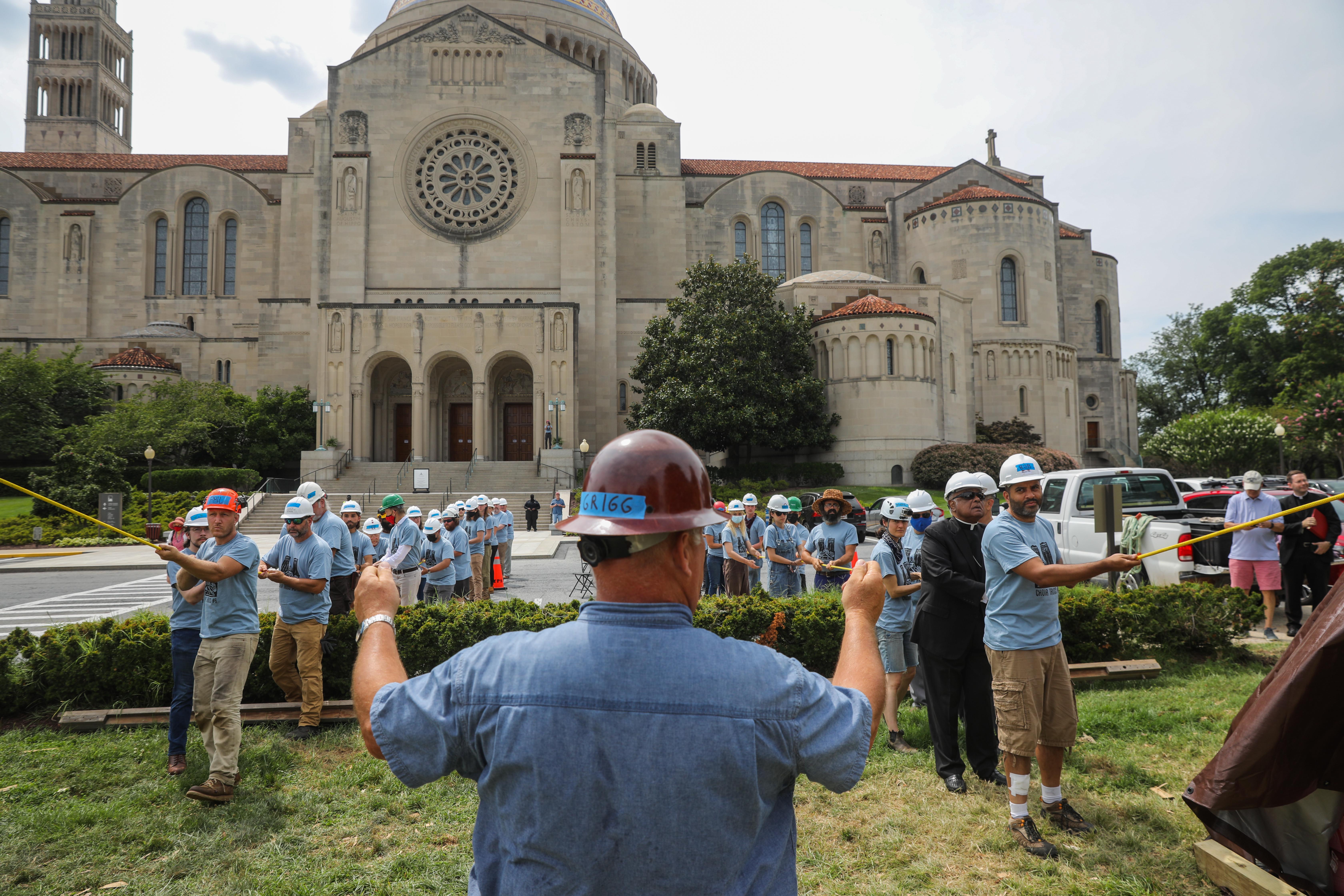A little over two years later, in the shadow of a landmark Catholic shrine in Washington, D.C., teams of architects, carpenters, artisans and students – and one cardinal-archbishop – slowly, gently pulled on rope lines to raise a painstakingly crafted roof truss that may help guide the builders who will replace Notre Dame’s roof. The Basilica of the National Shrine of the Immaculate Conception, the largest Catholic church in the United States, was a filmmaker’s dream backdrop to the proceedings.