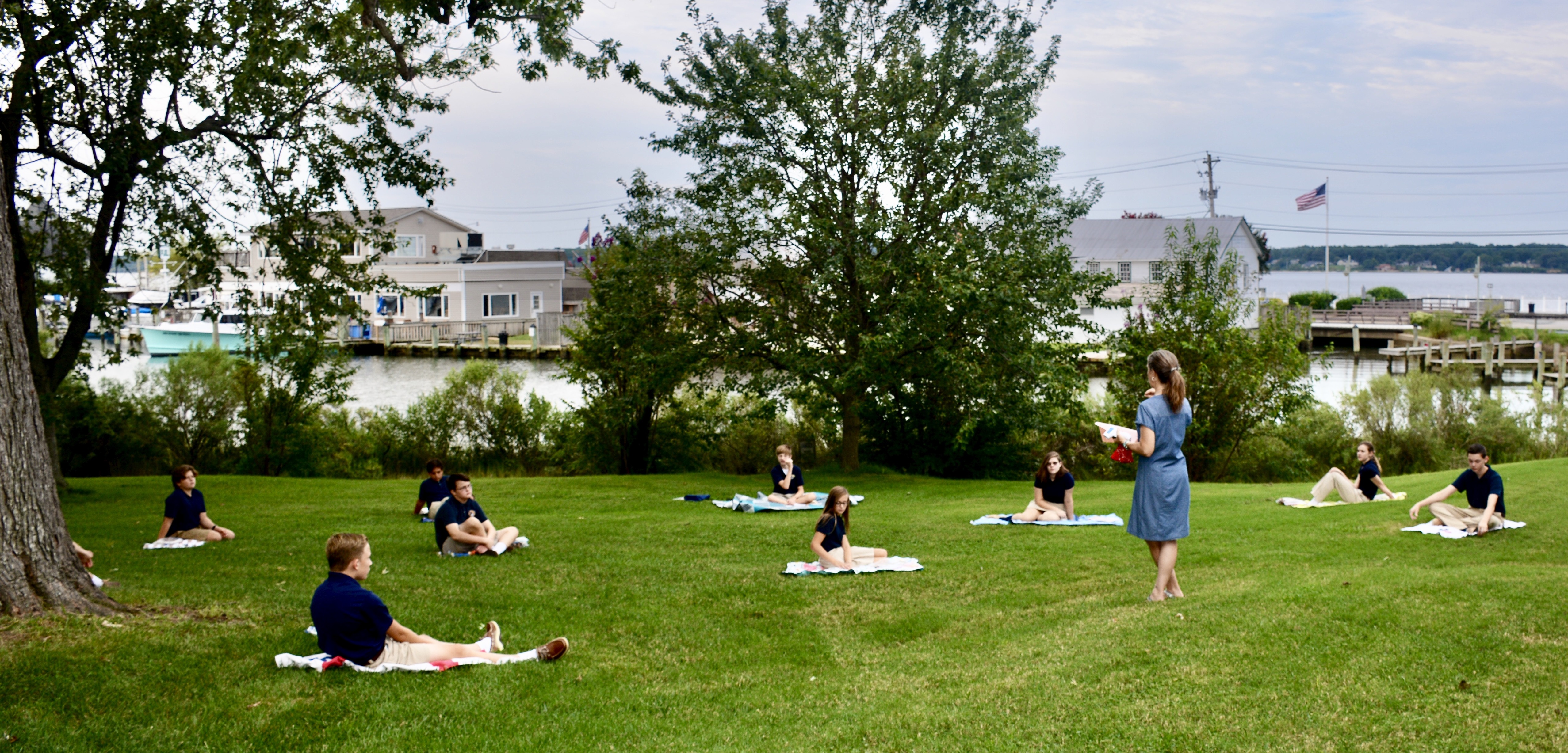 Our Lady Star of the Sea School is also making use of its grounds, with an outside patio set up as a classroom, a large tent providing another outside classroom, and with middle school students sitting on blankets for classes on the lawn overlooking the water.