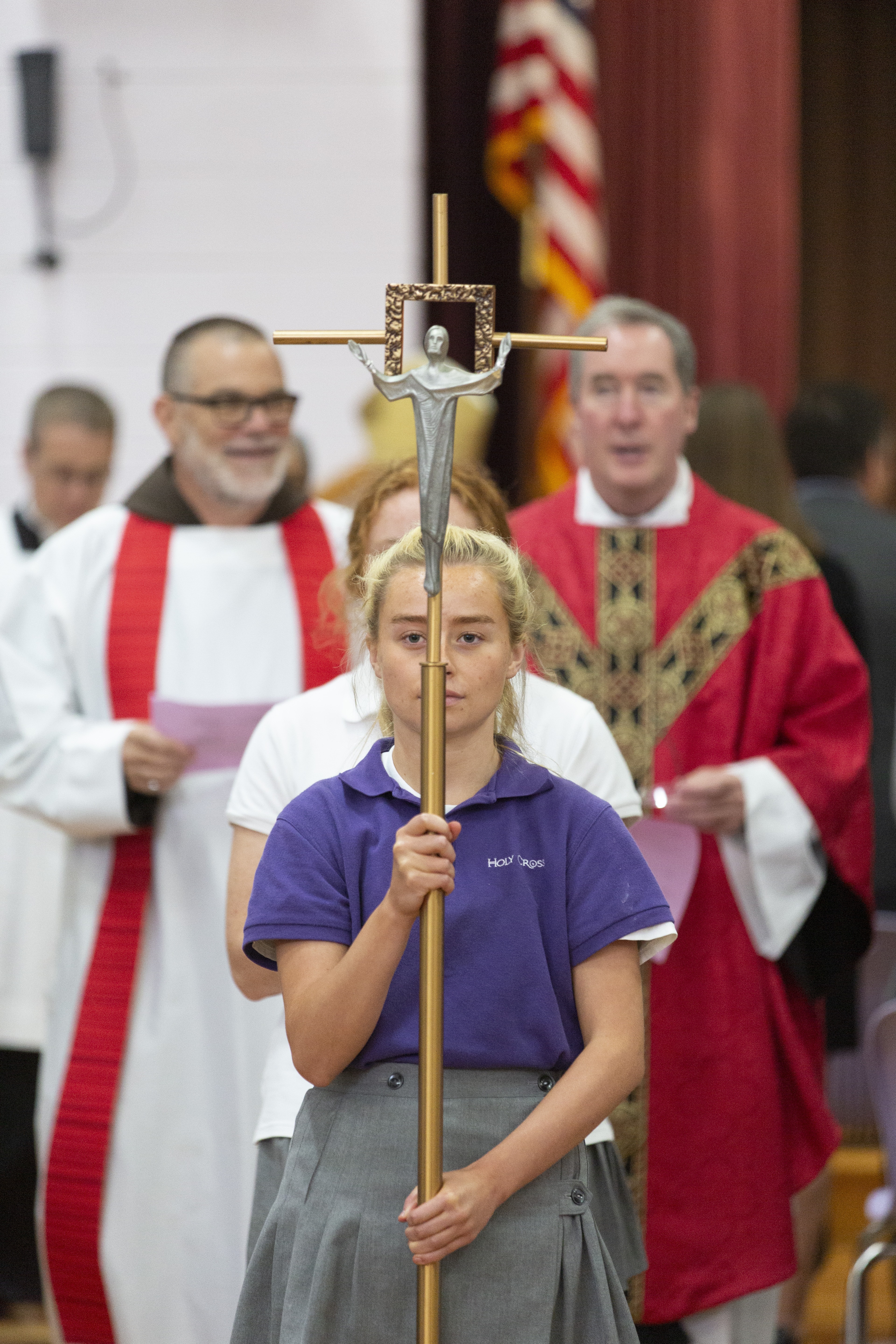 Singing the entrance hymn “Lift High the Cross,” the students, faculty, and parents of Holy Cross School and Parish in Garrett Park, Maryland, celebrated with Washington Archbishop Wilton Gregory their patronal feast day, the Exaltation of the Holy Cross, a day early on Sept. 13.