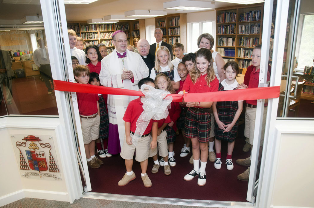 This past January’s polar vortex that partially froze Niagara Falls and caused a deep freeze in the Washington area, with temperatures near zero degrees, had a disastrous impact on Mary of Nazareth School in Darnestown, causing a pipe to burst, with water flooding a wing of the school. “A sprinkler pipe (much larger that a regular copper pipe) in the attic burst, spewing thousands of gallons of water in the library wing – completely destroying our math room, chapel, sacristy and preschool – (and causing) extensive damage to the library, too,” said Michael Friel, the principal of Mary of Nazareth School. On Oct. 1, water again spread through that wing, but this time, it was holy water sprinkled by Washington Auxiliary Bishop Barry Knestout, who blessed the new chapel and renovated rooms there on behalf of Cardinal Wuerl who was in Rome participating in the Synod on the Family. That renovation marks a highlight of the 20th anniversary year of Mary of Nazareth School, a regional school in upper Montgomery County that was opened in 1994 by Cardinal James Hickey, then the archbishop of Washington. In a back to school letter to parents, Friel noted the “amazing transformation” that had taken place in the school’s wing. “The new school chapel is spacious, brightly lit and finely appointed. The chapel now seats 60 for Mass and is perfectly positioned for the school. Father Ray Fecteau (the pastor of nearby Our Lady of the Visitation) did an excellent job communicating and executing his vision for the space,” the principal said, also thanking the Tom and Glory Sullivan Foundation for awarding the school a grant for the chapel’s furnishings. At the blessing, students representing each class sat in the chapel, joined by some parents, faculty, staff, board members, archdiocesan officials and other guests. “We ask the Lord to bless these new spaces we will use for prayer and study,” Bishop Knestout said. In a reflection, the bishop noted the difference that a little light in a dark night can make. “So it is for our faith,” he said, encouraging the students to share their faith with others, which he said can “make all the difference in the world.” Bishop Knestout then sprinkled holy water in the chapel and throughout the wing, noting that the water is “a sign of the saving waters of baptism.” He also blessed the renovated James Cardinal Hickey Library, named for the school’s founder whom he had served as a priest secretary. The bishop thanked all those who had made the school’s renovation possible, and he praised Mary of Nazareth School as “a wonderful example of a great Catholic school filled with faith, hope and love.” At a reception following the blessing, Father Fecteau, the pastor of neighboring Our Lady of the Visitation Parish throughout the school’s existence, noted that the chapel more than doubled in size and can now accommodate both sections of students in the individual grades, so they can attend regular Masses together with their teachers. The new chapel is brighter and in more of a place of primacy in the school, he said. Nancy DeWitt, the school’s librarian, said “the kids are enjoying the open space” of the renovated library.” January’s flood damaged the library’s carpet and flooring, which had to be replaced. Eighth grade students carried boxes of the library books into the Katie Fitzgerald Center, the school’s gymnasium and multi-purpose space, and later, student and parent volunteers spent two days re-shelving the books in the renovated library. The restored media center next to the library includes 16 new touch-screen computers, thanks to a memorial donation from the Tucker family in the name of Don and Bee Heck. The renovated wing also includes two brand-new math rooms constructed to support the school’s math initiative for grades four through eight, and Mary of Nazareth’s preschool has been completely renovated. In the back to school letter to parents, Friel also praised the school’s facilities director, Steve Munzer, who managed the renovation from the outset, assessing the damage and directing the clean-up with the help of a work crew for long hours right after the flood, and then overseeing the restoration work in the months that followed.