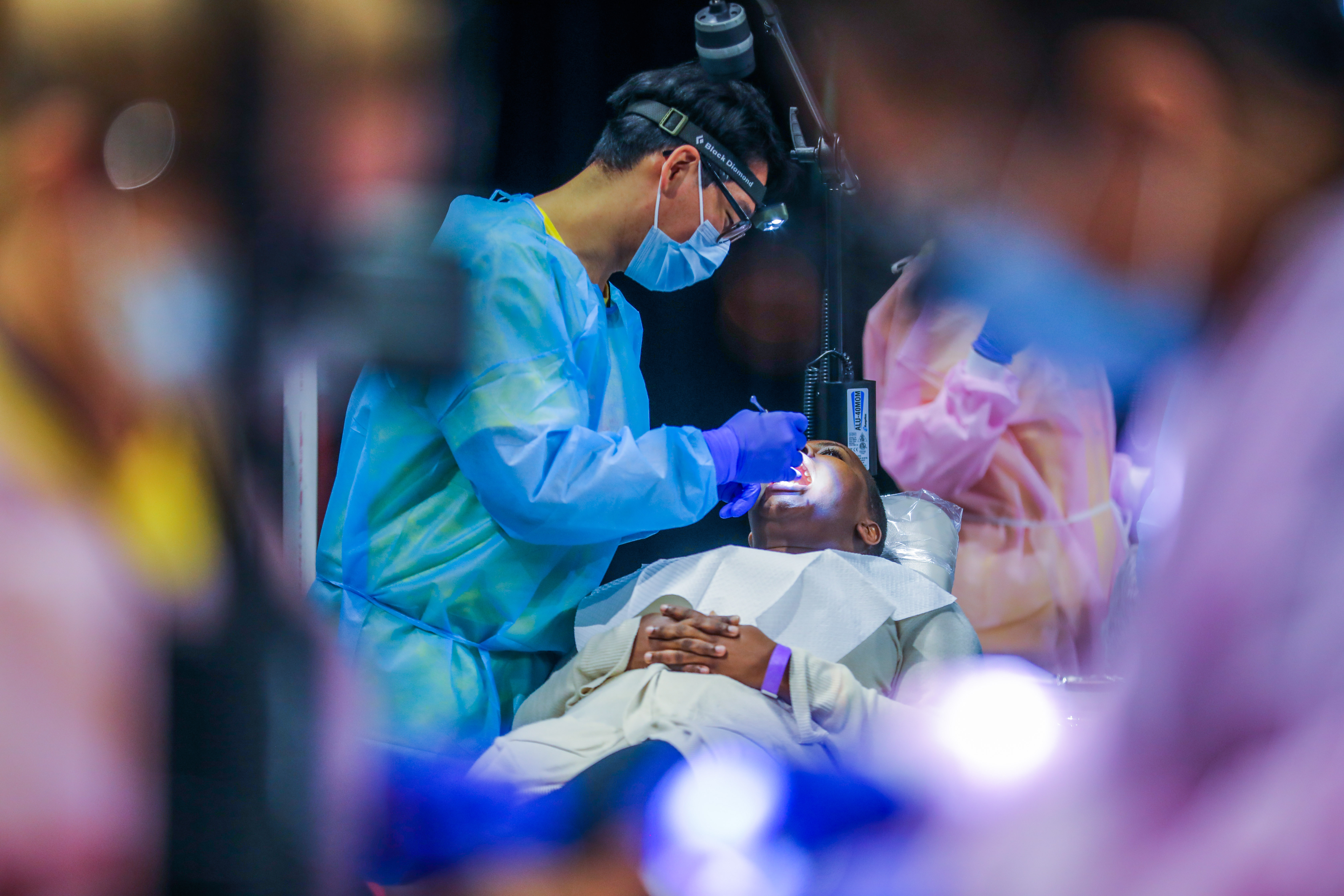Catholic Charities of the Archdiocese of Washington, the University of Maryland School of Public Health and the Maryland State Dental Association Foundation jointly hosted The Mid-Maryland Mission of Mercy, a free dental clinic for uninsured adults in the University of Maryland's Xfinity Center on Sept. 13 and 14. The free clinic served more than 1,000 patients in need, who were helped by 500 dental and medical professionals who volunteered their services. More than 100 dental chairs were set up on the floor of the University of Maryland's basketball arena for the dental clinic. (CS photos/Andrew Biraj)