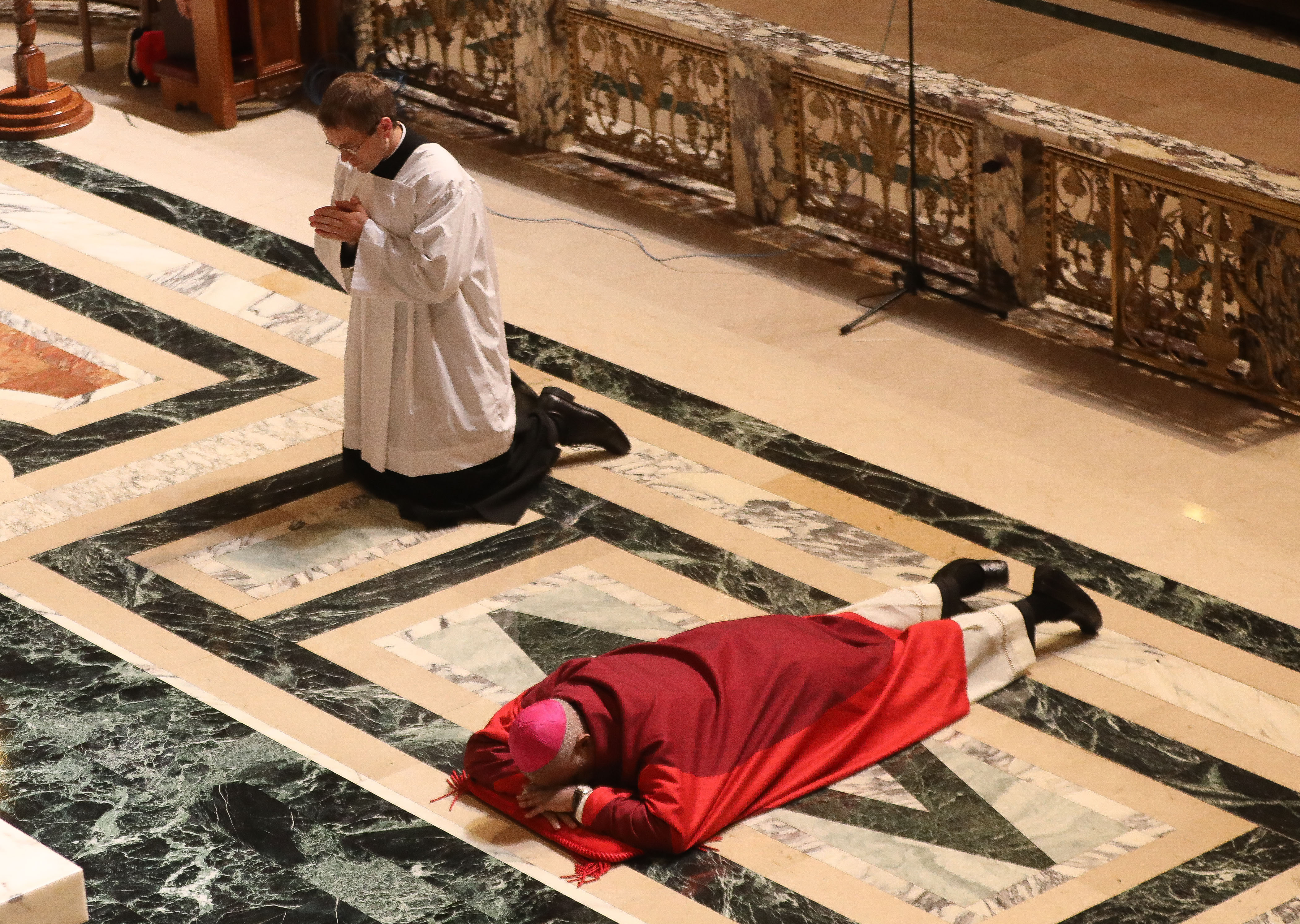 The Good Friday liturgy celebrated by Washington Archbishop Wilton Gregory at St. Matthew's Cathedral on April 10 included a reading of the narrative of Christ's Passion from the Gospel of John, veneration of the cross, and special intercessions, including prayers for people affected by the coronavirus pandemic. Since no public Masses are being held at this time due to government mandated safety precautions against the spread of the coronavirus, there was no congregation in the cathedral during the liturgy, but it was livestreamed on the archdiocese's YouTube channel and viewed by more than 2,300 people throughout the Archdiocese of Washington, across the United States and around the world. (CS photos/Andrew Biraj)