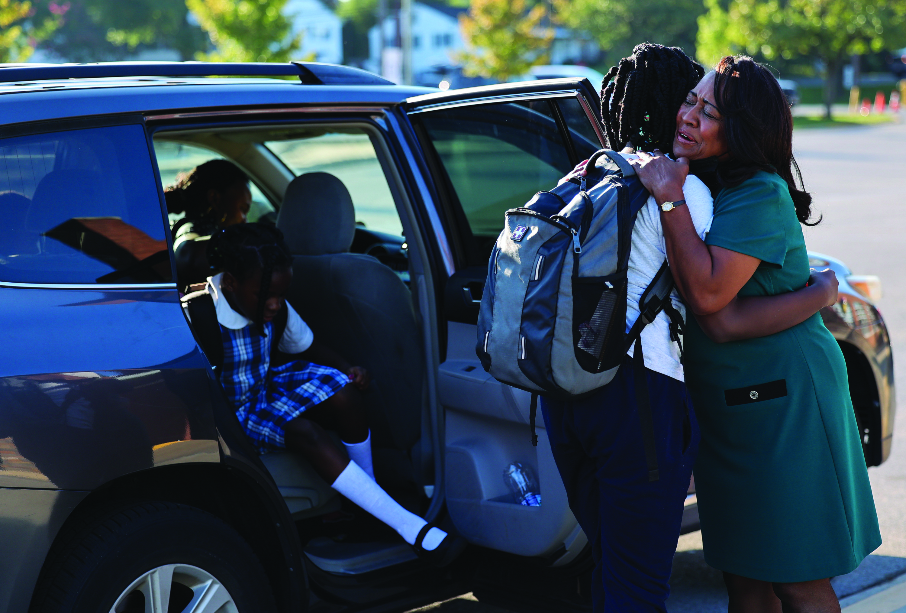 Many Catholic schools in The Roman Catholic Archdiocese of Washington have opened their doors on another new school year. Other schools have scheduled their openings in the days ahead. Above, students at St. Mary’s School in Landover Hills, Maryland get a hug from principal LaSandra M. Hayes before the start of the first day of school there on Aug. 23. In the photos below, Hayes welcomes more students on the first day of school and moms give their students a goodbye kiss as they drop them off at school. (CS photos by Andrew Biraj)