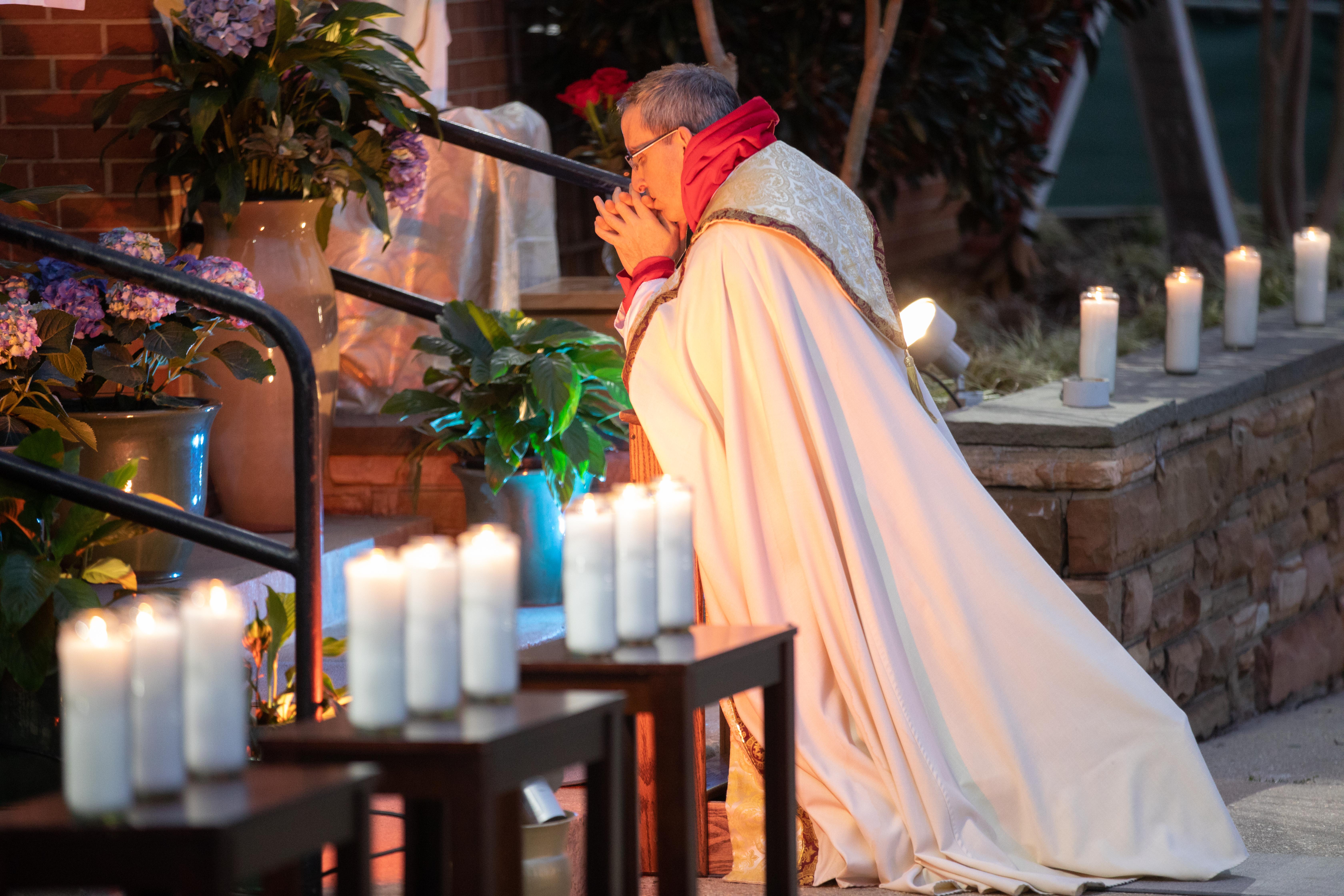 Father Dan Leary, St. Andrew's pastor, holds the monstrance during the Exposition of the Holy Sacrament. The priest led the Eucharistic Adoration from an altar facing the church parking lot. Some people knelt in prayer beside their cars during the Adoration. In a related Catholic Standard article, Father Leary said that as people aren't able to participate in public Masses together at this time, they are being drawn to Christ present in the Eucharist in Adoration. “There’s a very beautiful paradox taking place. There’s a contradiction in people’s lives in the fact that they’re starting to realize what they don’t have,” the priest said. “The absence is creating a longing for presence. What God is allowing is this divine encounter of love. He’s turning the hearts and eyes of the people back to Him.” (CS photos/Andrew Biraj)