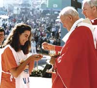 Pope John Paul II distributes Communion to a young woman at a World Youth Day Mass in Monte de Gozo, Spain, in August 1989. Pope Benedict XVI is scheduled to beatify Pope John Paul II on May 1 in Rome. (CNS PHOTO FROM L’OSSERVATORE ROMANO, ARTURO MARI)