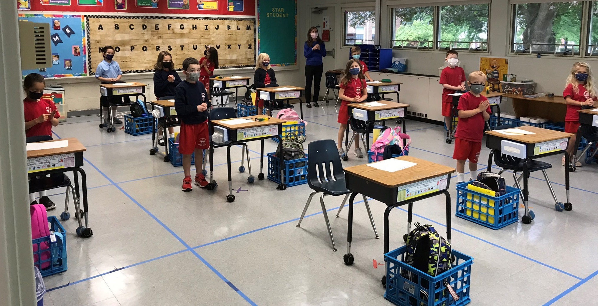 Those protocols include students directly entering their classroom from an exterior door and not using the hallway unless to use the restroom; requiring the use of face masks at all times; classrooms prominently marked with six-foot social distance parameters; larger classes using the school gymnasium and a modular trailer in order to guarantee appropriate social distancing; special subject teachers rotating to students’ classrooms so that students do not have to change and share classrooms; and splitting the rather large kindergarten class into four separate classes.