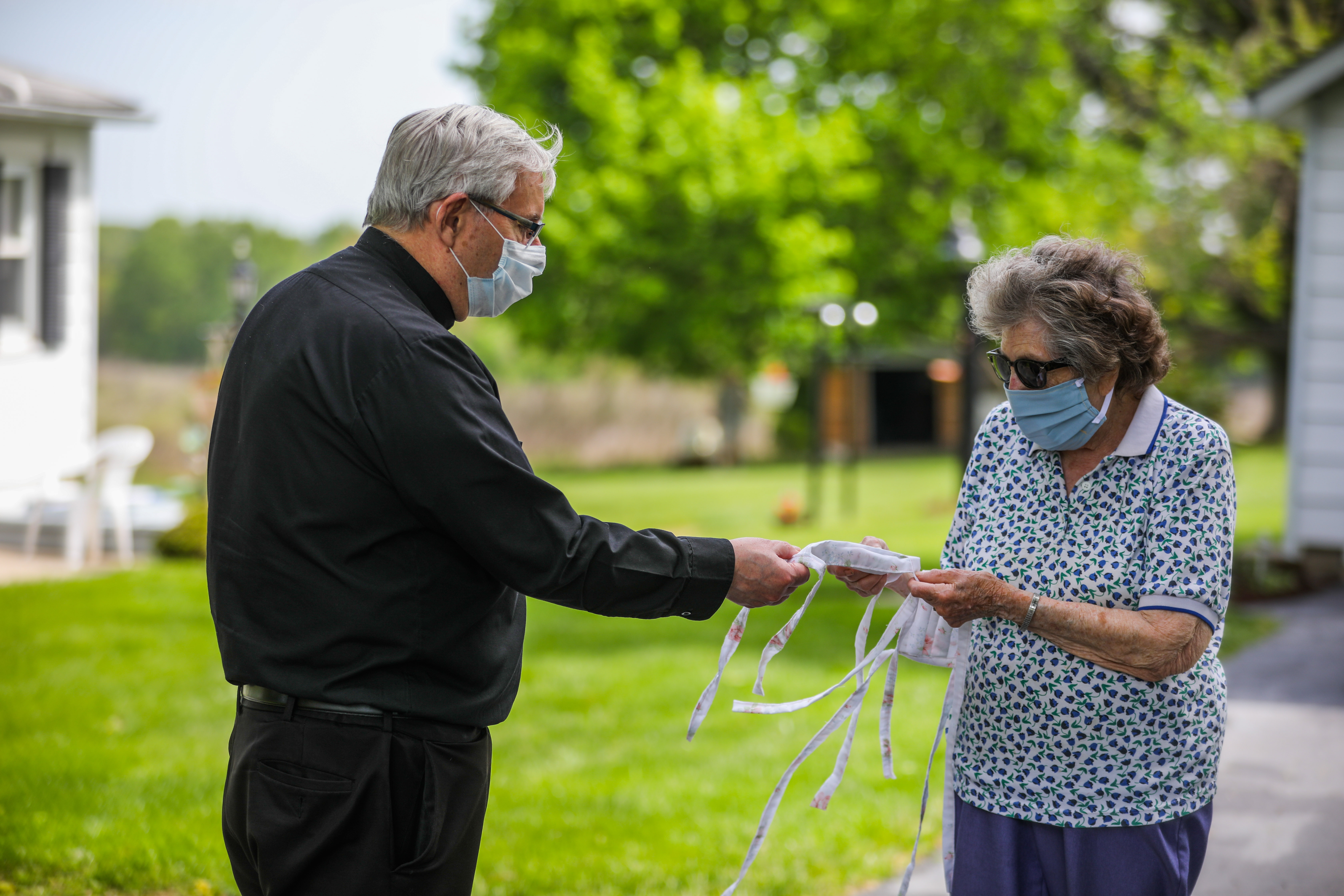 - Parishioners have begun sewing facemasks that they leave in a basket at the back of church. The facemasks are available for other parishioners who need them, and are also given to Catholic Charities for staff members, volunteers and clients. Father Pierce later praised the outpouring of donated sewn facemasks as “a bit of a cottage industry.”