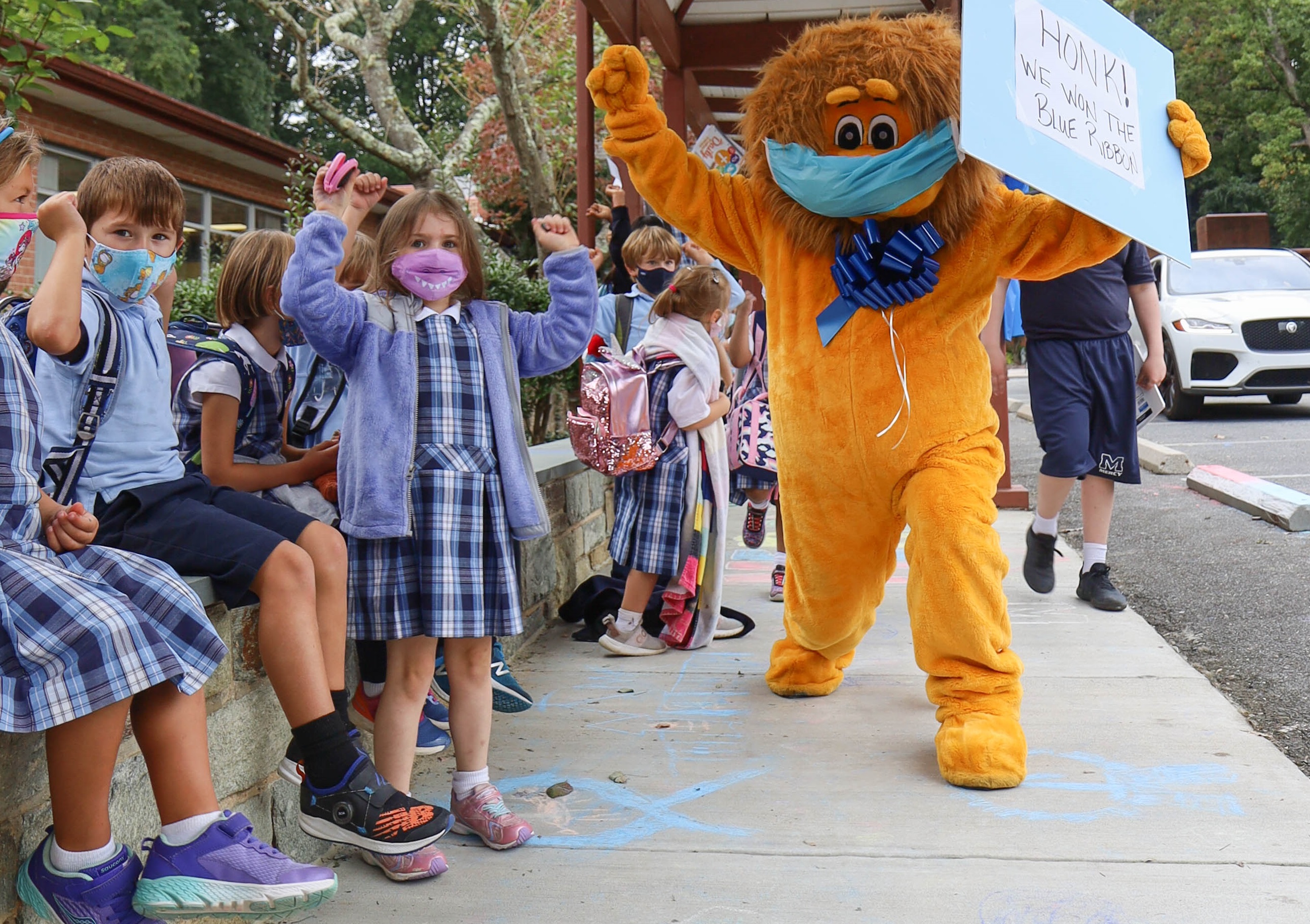 The students at Our Lady of Mercy were all smiles as they rushed out of the school building on Thursday afternoon. They were greeted by the school’s lion mascot, Pride, complete with a mask of its own, holding a sign that read “Honk! We won the blue ribbon.”