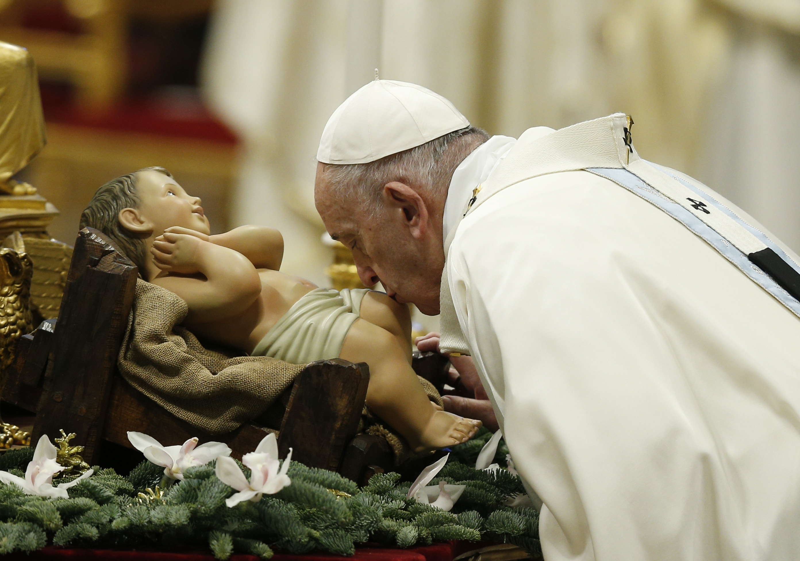 The newborn Jesus received his first caresses from Mary and exchanged his first smiles with her, the pope said. "With her, he inaugurated the revolution of tenderness. The Church, looking upon baby Jesus, is called to continue it."