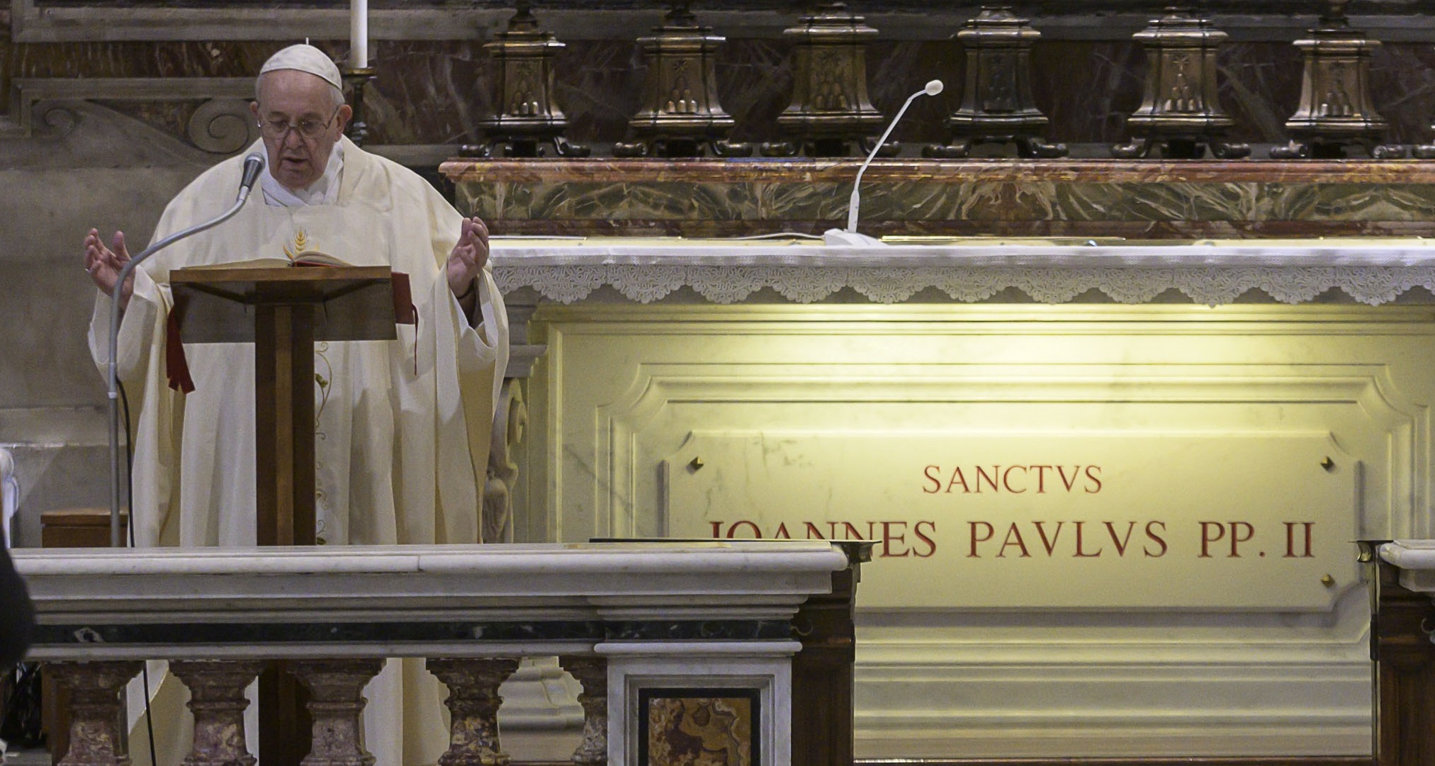 The Mass at St. John Paul's tomb was scheduled to be the last of Pope Francis' early morning Masses to be livestreamed online; with churches opening in Italy and elsewhere, the pope encouraged people to attend Mass in their local parish communities while respecting health norms.
