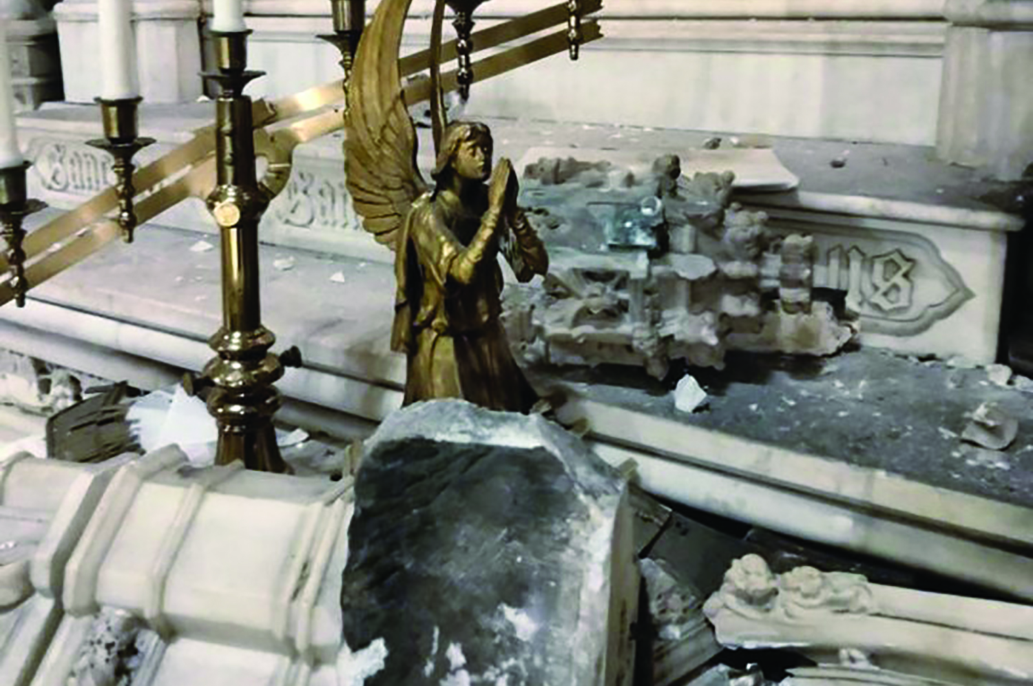 In the course of the crime, angel statues flanking the tabernacle were decapitated, and consecrated hosts from inside the tabernacle were thrown all over the altar, according to a Brooklyn diocesan news release.