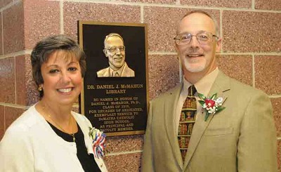 The library at DeMatha Catholic High School in Hyattsville has been named in honor of its principal, Daniel McMahon, shown with his wife Donna, who unveiled the plaque on Oct. 15.