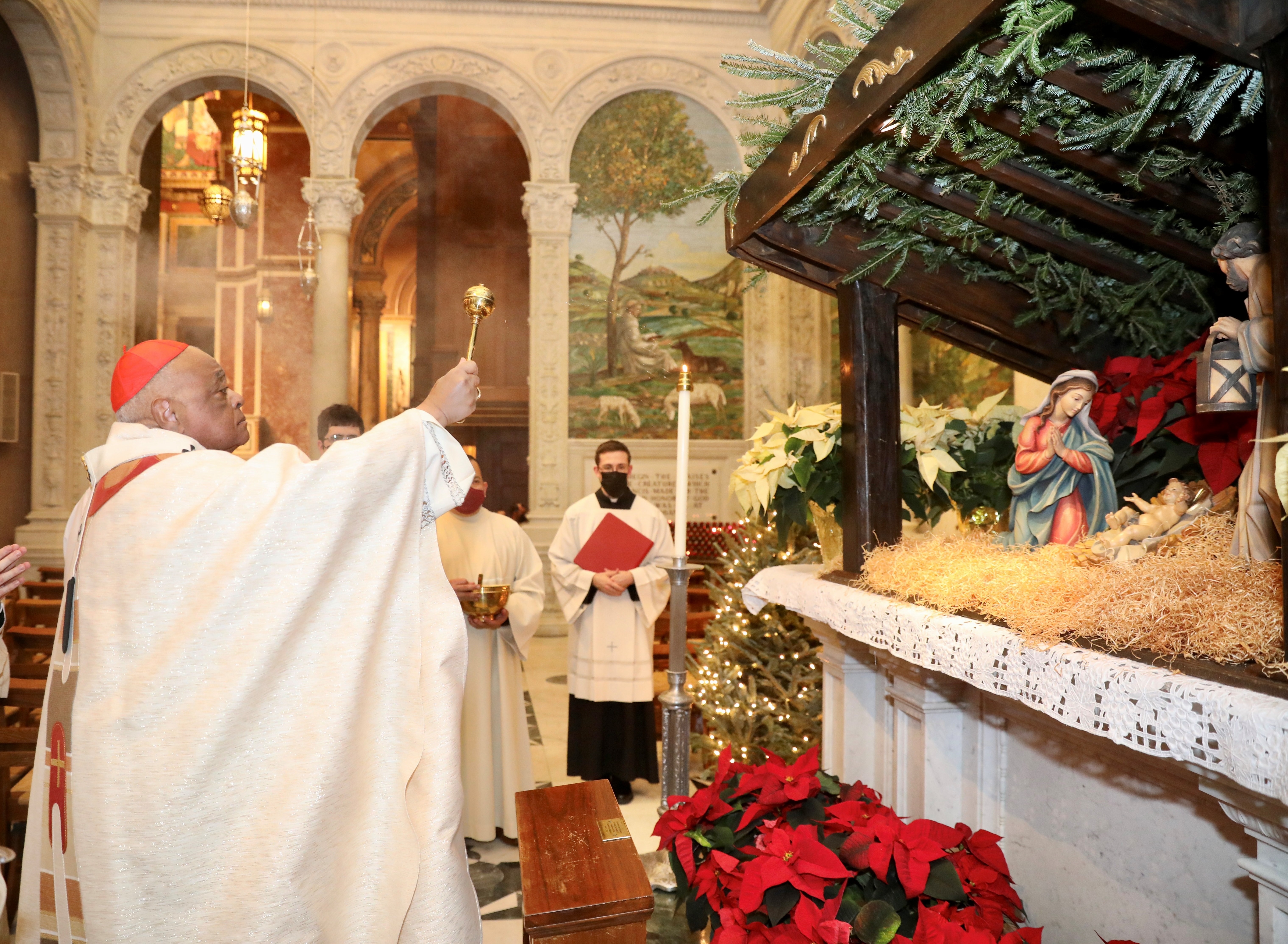 Then Cardinal Gregory processed toward the church’s nativity scene and knelt before it in prayer. Moments later, he stood and said, “When we look upon these figures, the Christmas Gospel comes alive…” He prayed that the scene will “remind us of the humble birth of Jesus and raise our hearts to him who is God with us and Savior to all.” Then he sprinkled holy water on the manger scene and incensed it.