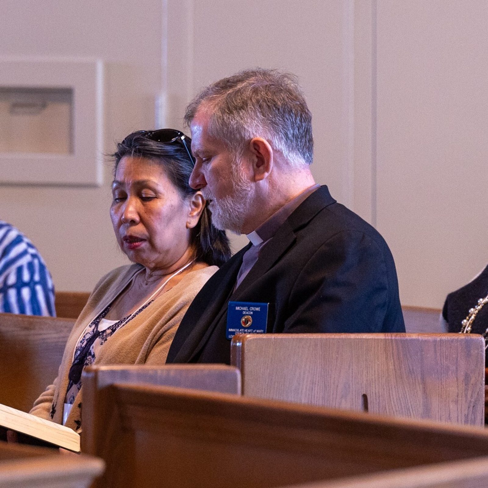 About 100 permanent deacons and their wives, joined by deacon candidates, sat together at the Mass, with some of the deacons wearing their white dalmatic vestments and stoles, and others wearing clerical black or grey.