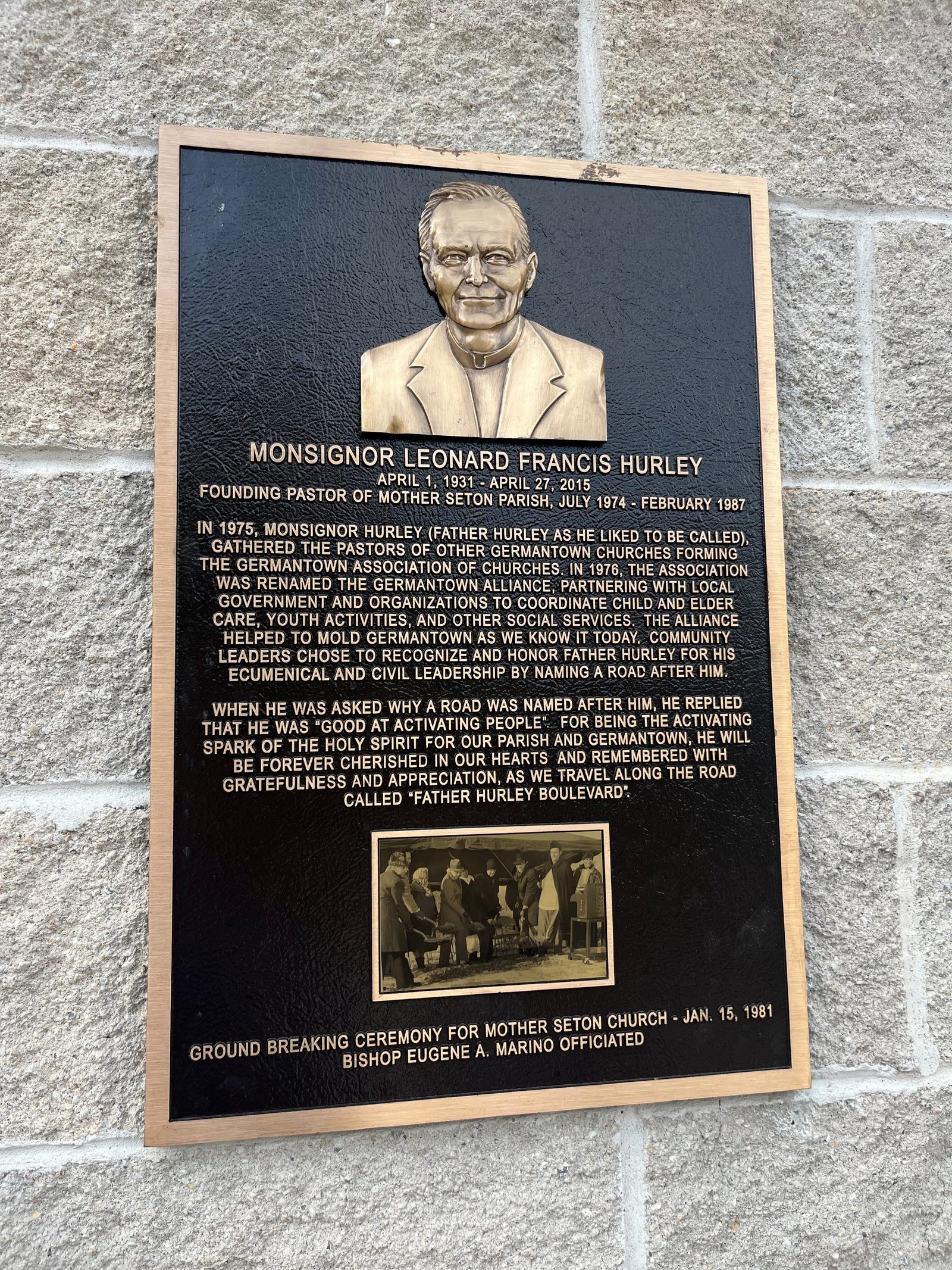 Msgr. Hurley, who served at Mother Seton from 1974 until 1987, was known for bringing members of the community together for outreach programs, ecumenical gatherings, civic activities and social events. In 1988, Father Hurley Boulevard in Germantown was dedicated in his honor, and this May, a plaque recognizing his contributions to the parish and community was placed near the entrance of Mother Seton Church. The priest died in 2015.