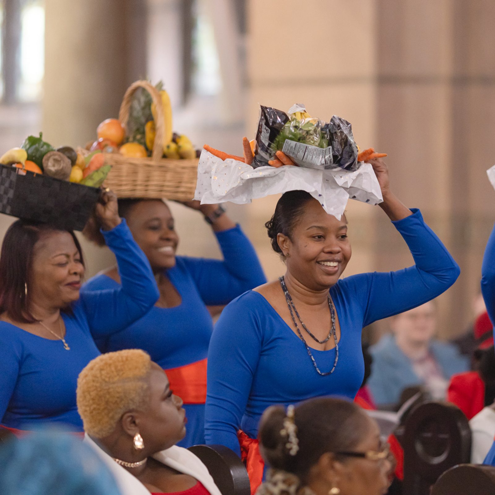 At the joyful New Year’s Day Mass for the Haitian community, prayers were recited and songs were sung in French and Creole. Five girls wearing blue, red and white dresses performed a liturgical dance, and later in the offertory procession, six women in blue dresses danced down the center aisle as they held woven baskets on their heads that were filled with fruits and vegetables.