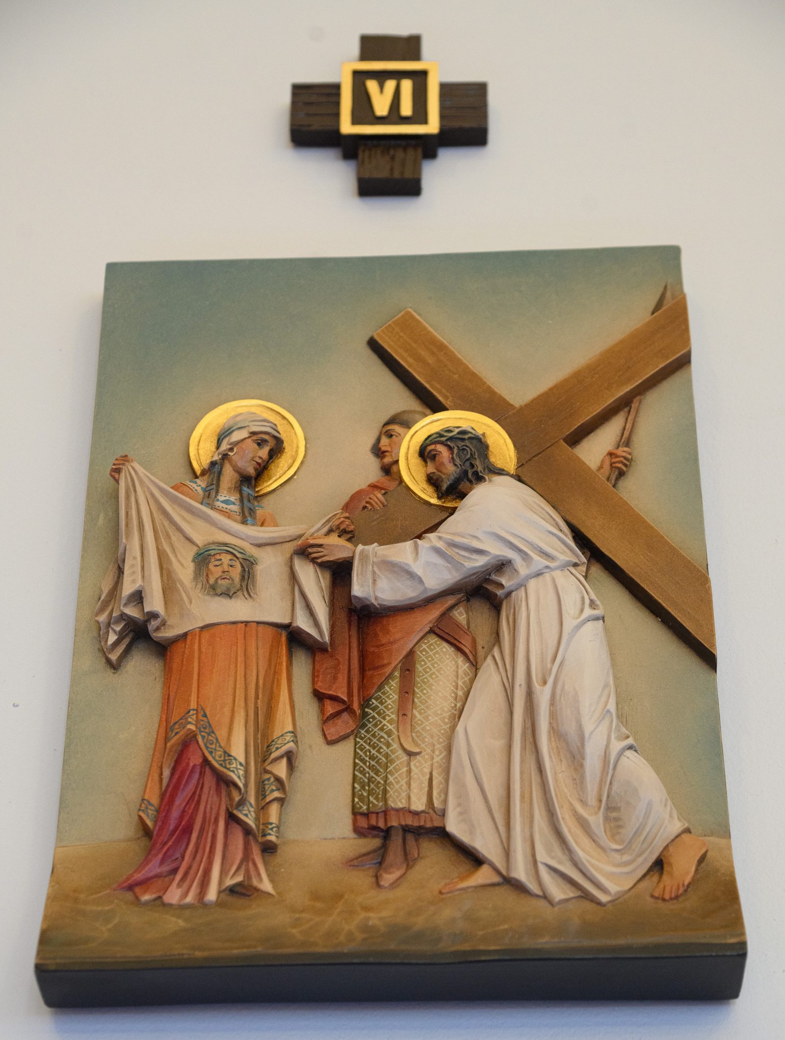 The Stations of the Cross, which hang on the walls around the nave of the church, depict the Via Dolorosa, the path that Jesus walked from His condemnation to His crucifixion. They are made from a combination of glass, stone, plastic and limestone fibers, creating a three-dimensional representation of Christ’s Passion.