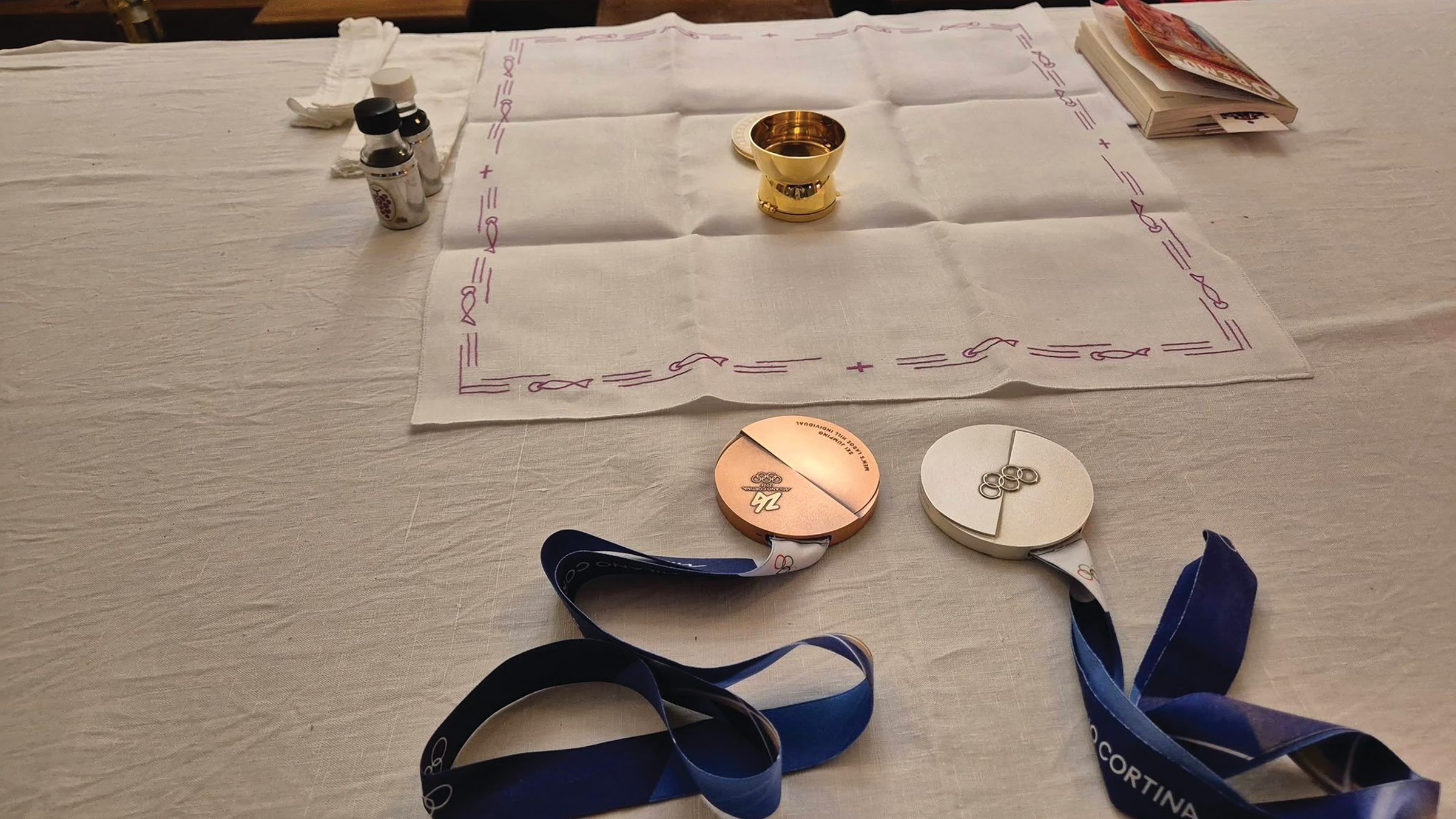 Catholic influencers around the world shared Father Plen’s pictures of Tomasiak’s medals laying on the altar during Mass in a Predazzo Church chapel.