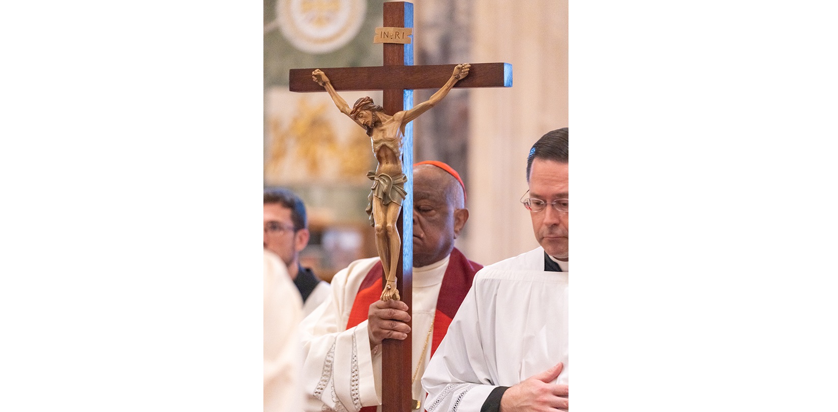 Washington Cardinal Wilton Gregory elevates the cross at the Cathedral of St. Matthew the Apostle during an April 7 Good Friday liturgy, which included the reading of the gospel account of Christ's passion and death, and people venerating the cross, on the most solemn day of the church year. (CS photos by Mihoko Owada)