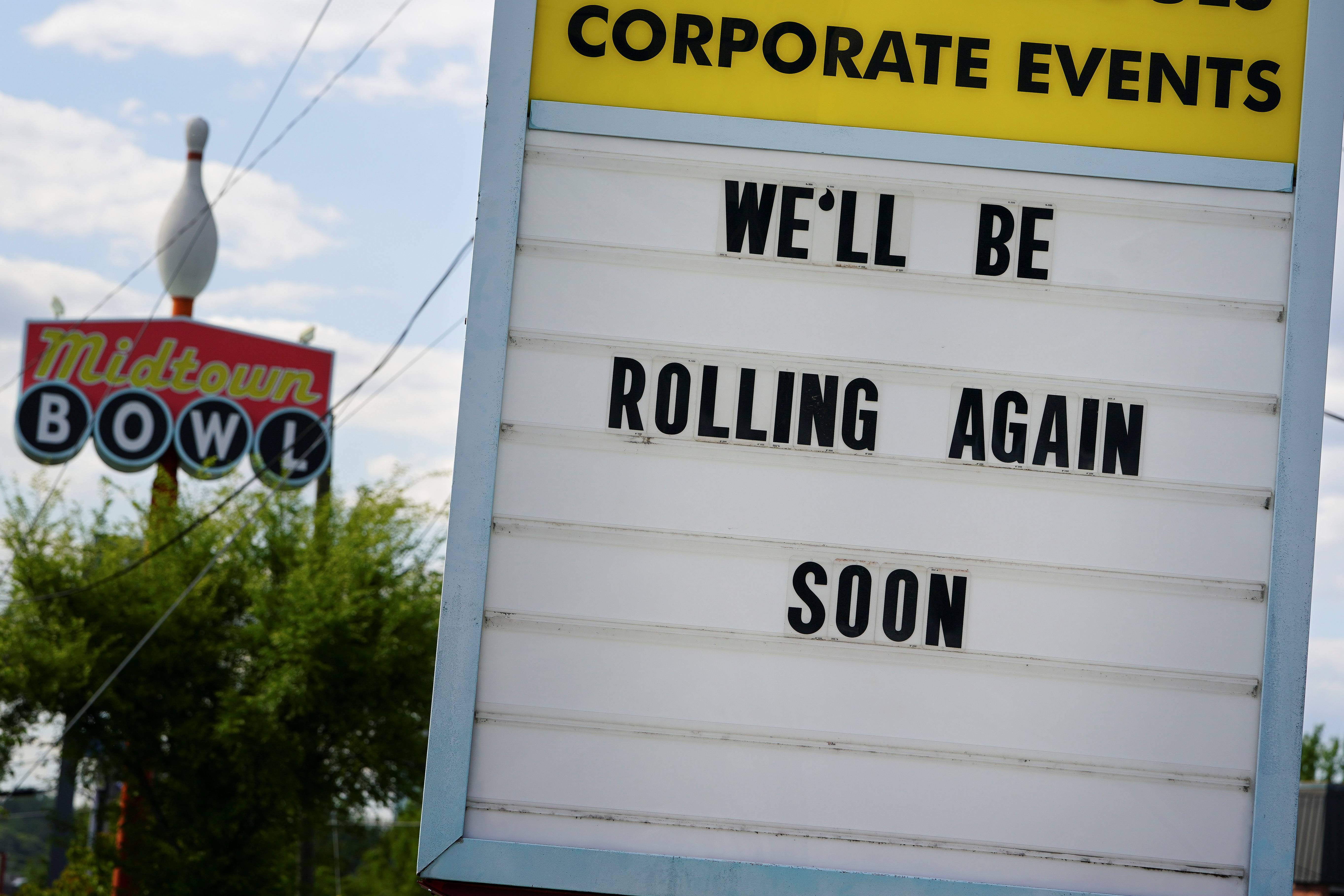 A message in Atlanta is seen on a sign outside the Midtown Bowl bowling alley April 21, 2020, days before the phased reopening of businesses and restaurants from coronavirus disease restrictions. (CNS photo/Elijah Nouvelage, Reuters)