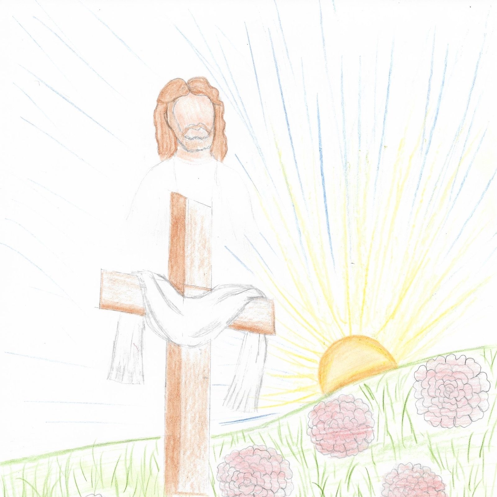 “My drawing is a picture of Jesus when he resurrected on Easter Sunday! In my opinion Easter Sunday is the happiest day of Holy Week because it is when Jesus is risen and is with us again. He is happy to be with us, which is why we should be with him by going to Mass or praying to Jesus and thanking him for dying on the cross to save us. After this week of suffering and sorrow for Jesus, he wants to share all his joy. Easter reminds us that there is always hope, just like how we hoped for Jesus’s resurrection. It is important to remember how lucky we are that Jesus took all our sins on the cross and died for us!” – Artwork and writing by Reagan Perraut, seventh grade, St. Bartholomew School, Bethesda