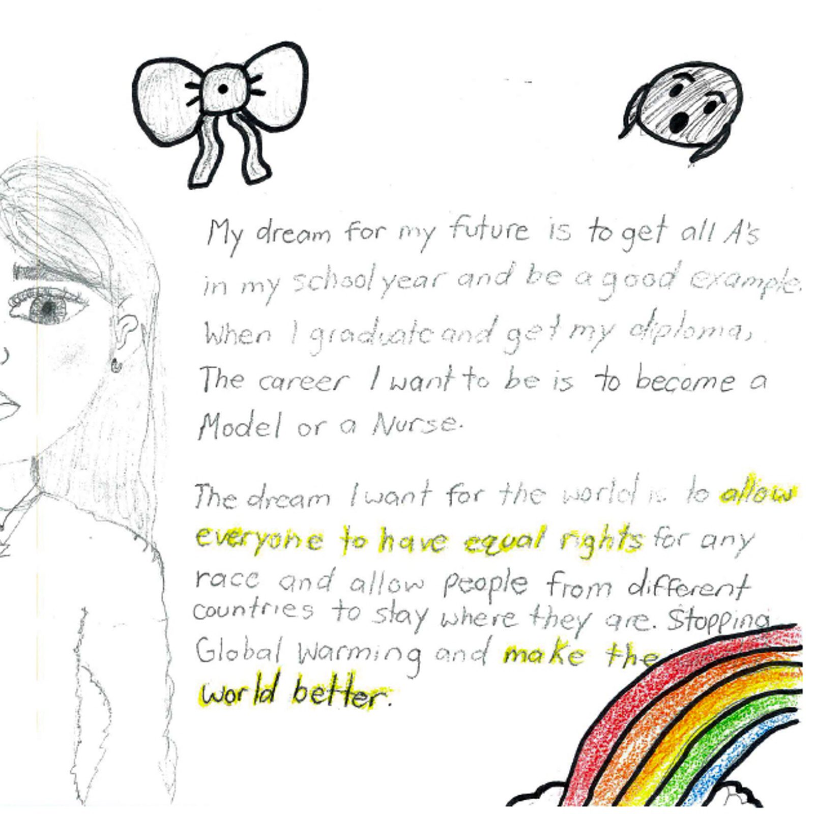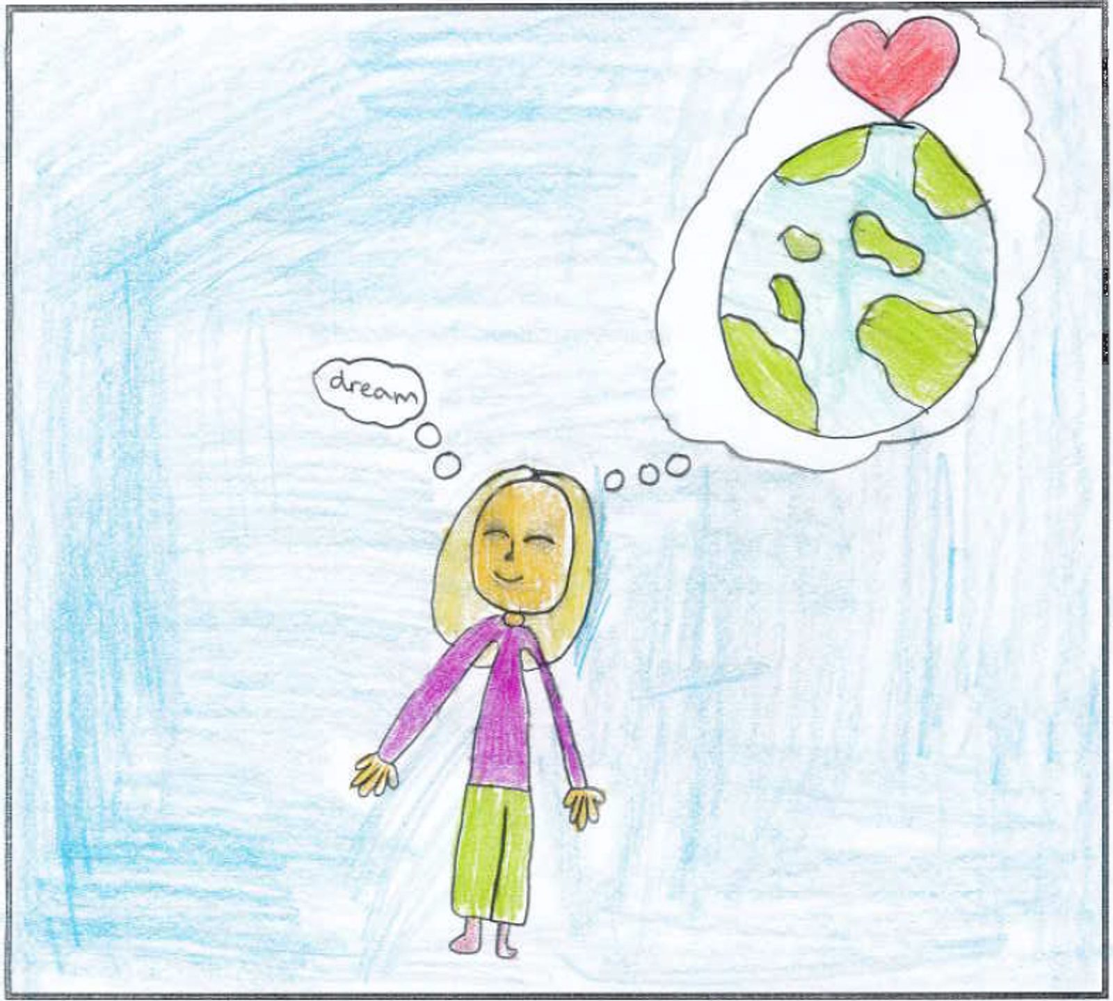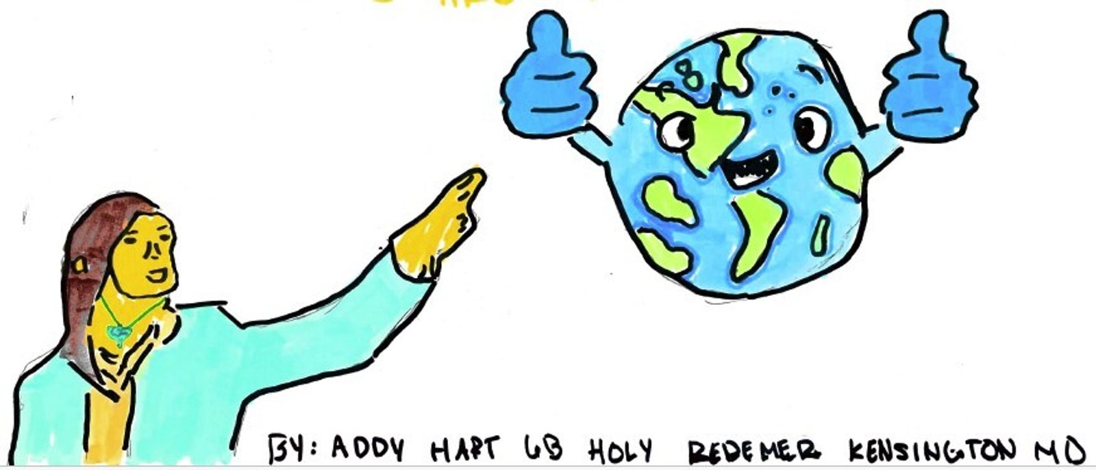 “My dream for the world is for it to be a non-polluted, happy, dangerless place. This is because every time I go outside, I see trash, and it makes me sad. Also I see homeless people outside, and they are all sad…” – Drawing and writing by Addy Hart, sixth grade, Holy Redeemer Catholic School, Kensington