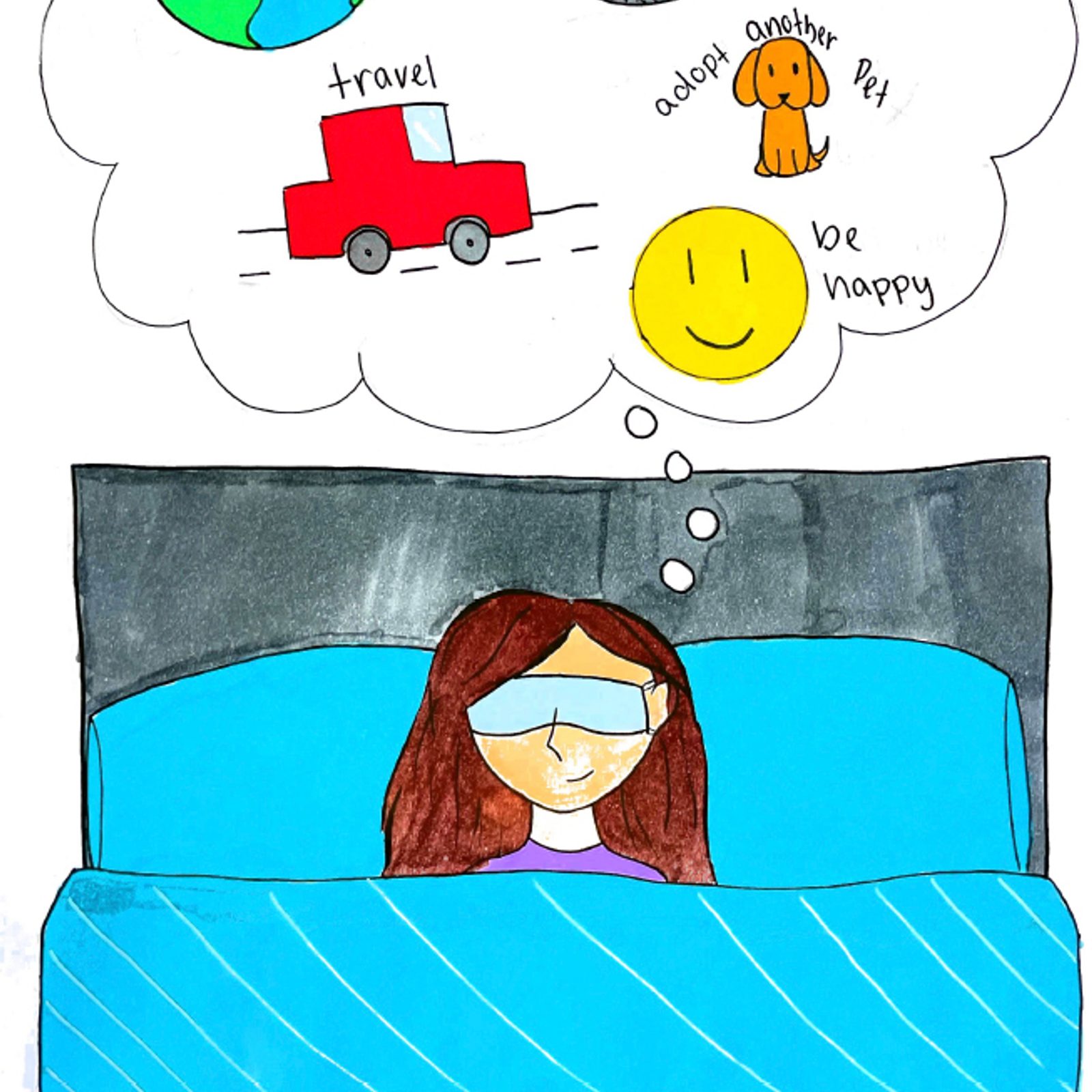 “When we fall asleep, we can have crazy dreams, but sometimes we are very passionate about them. For example, I want to be a pediatrician or a sheep farmer, and those ideas come from dreams. We can learn from our dreams to work hard and thrive in school. As a pediatrician, I want to see the smile on a little girl or boy’s face when they leave the doctor’s office. I also want to care for the sheep, be around them, and have other animals on that imaginary farm. When we wake up, those dreams inspire us to strive for our goals.” – Artwork and writing by Elena Millan-Obregon, sixth grade, St. Bartholomew Catholic School, Bethesda
