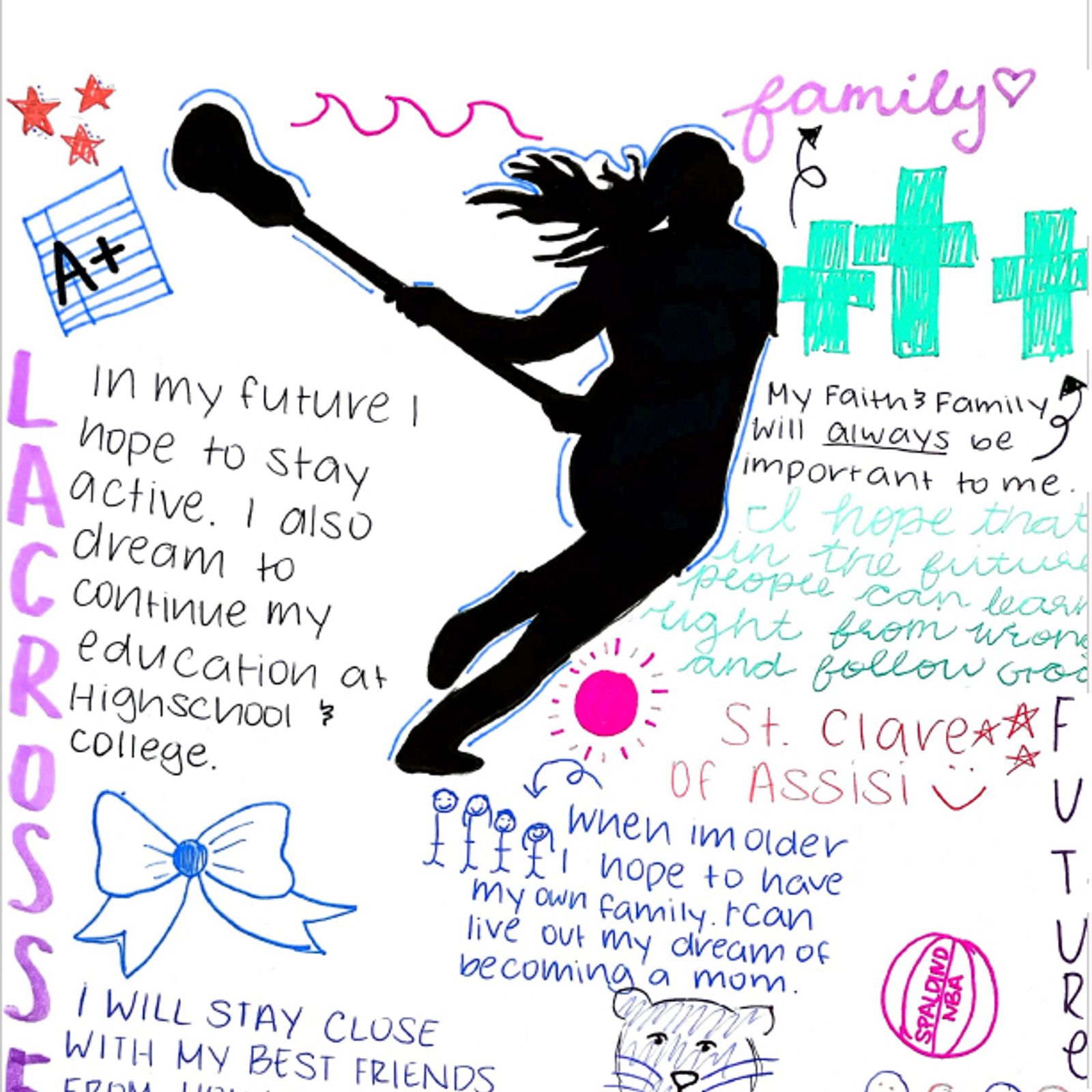 “My dream for my future is to play on the USA lacrosse team. I can represent my country in my favorite way. The USA lacrosse team plays every four years, and I always look forward to it. I want to be a part of the team that little girls look forward to watching. I could get the opportunity to play with all-star lacrosse players and build close relationships with every single one of them. I will continue to work, dream and believe to make the USA lacrosse team until it’s finally a reality.” – Artwork and writing by Megan Silverman, eighth grade, St. Elizabeth School, Rockville