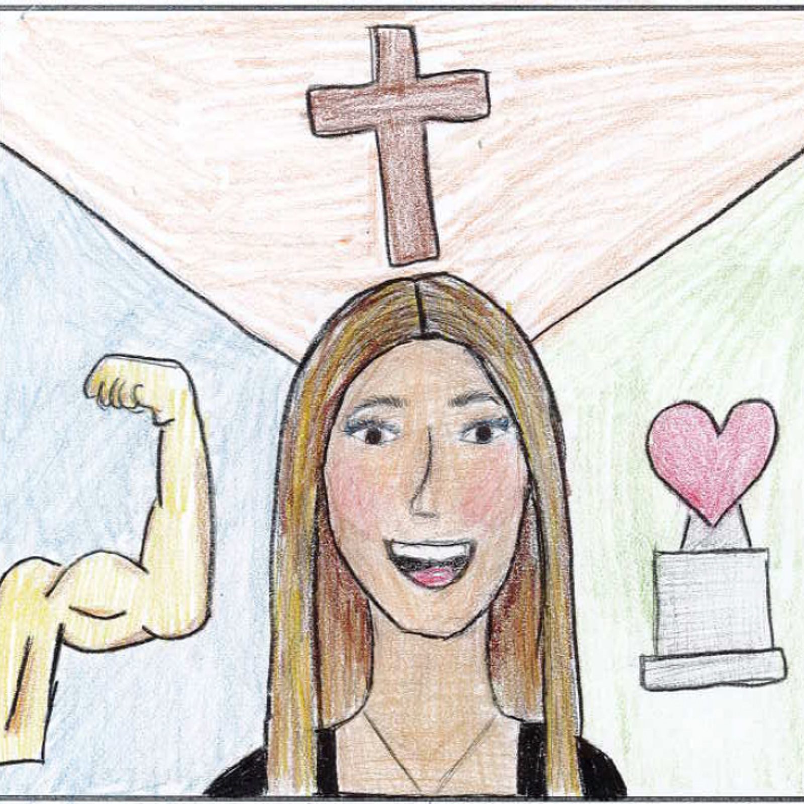 “In my future, I want to grow and prosper in every way. I want to become stronger as a person and to become an advocate for myself and others. I want to put my heart on a pedestal for everyone to see and never be afraid to do the right thing. Finally, I want to grow in my faith above all else. I want to strengthen my relationship with God and display my love for Jesus. The symbol of the cross ties my whole drawing together.” – Artwork and writing by Katie Splaine, eighth grade, St. Elizabeth Catholic School, Rockville, Maryland