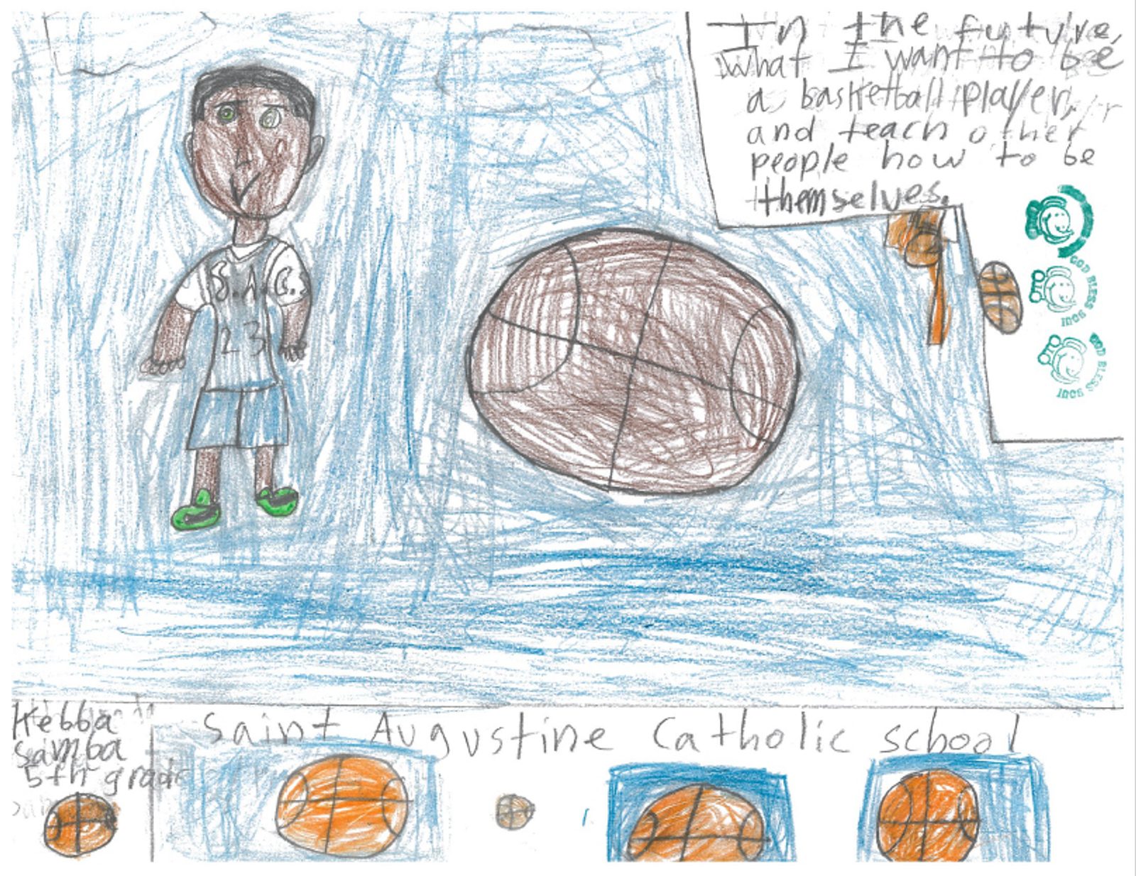 “In the future, I want to be a basketball player, and teach other people how to be themselves.” – Artwork and writing by Kebba Samba, fifth grade, St. Augustine Catholic School, Washington, D.C.