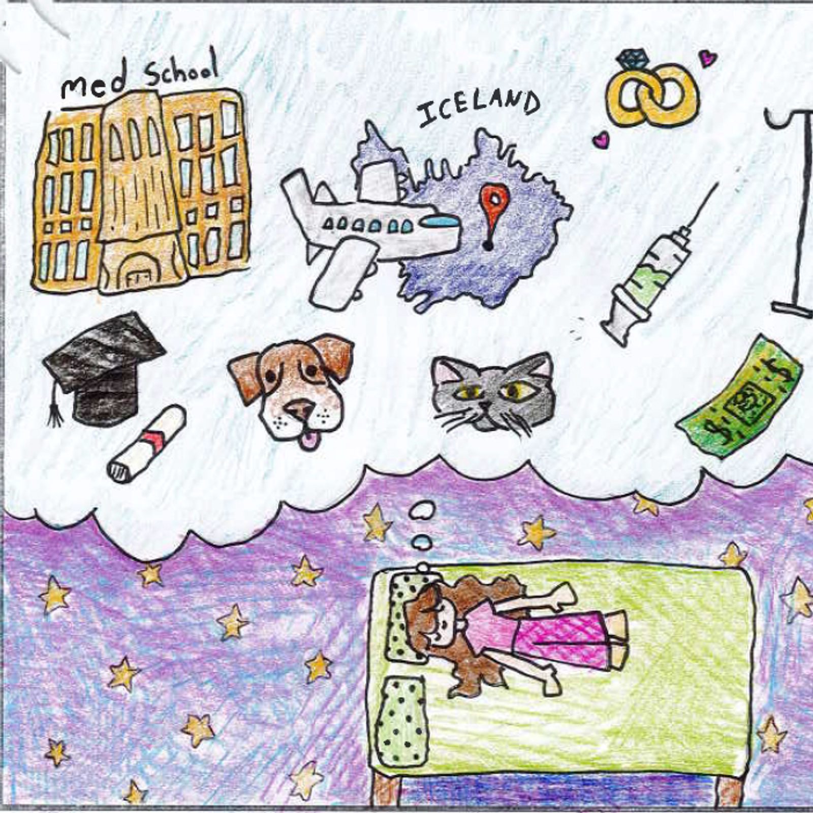“I have a lot of dreams for my future, but this is what I truly hope happens! I hope that I can graduate from med school. After that, I would like to move to Iceland. I want to then work in Reykjavik, Iceland. I would work at the hospital as an anesthesiologist (the doctor that puts you to sleep for surgery). I would like to do this not only for the high income, but mainly for helping people every day! I hope my dreams for the future come true, and everyone else’s do too!” – Artwork and writing by Lily Nolan, sixth grade, St. Elizabeth Catholic School, Rockville