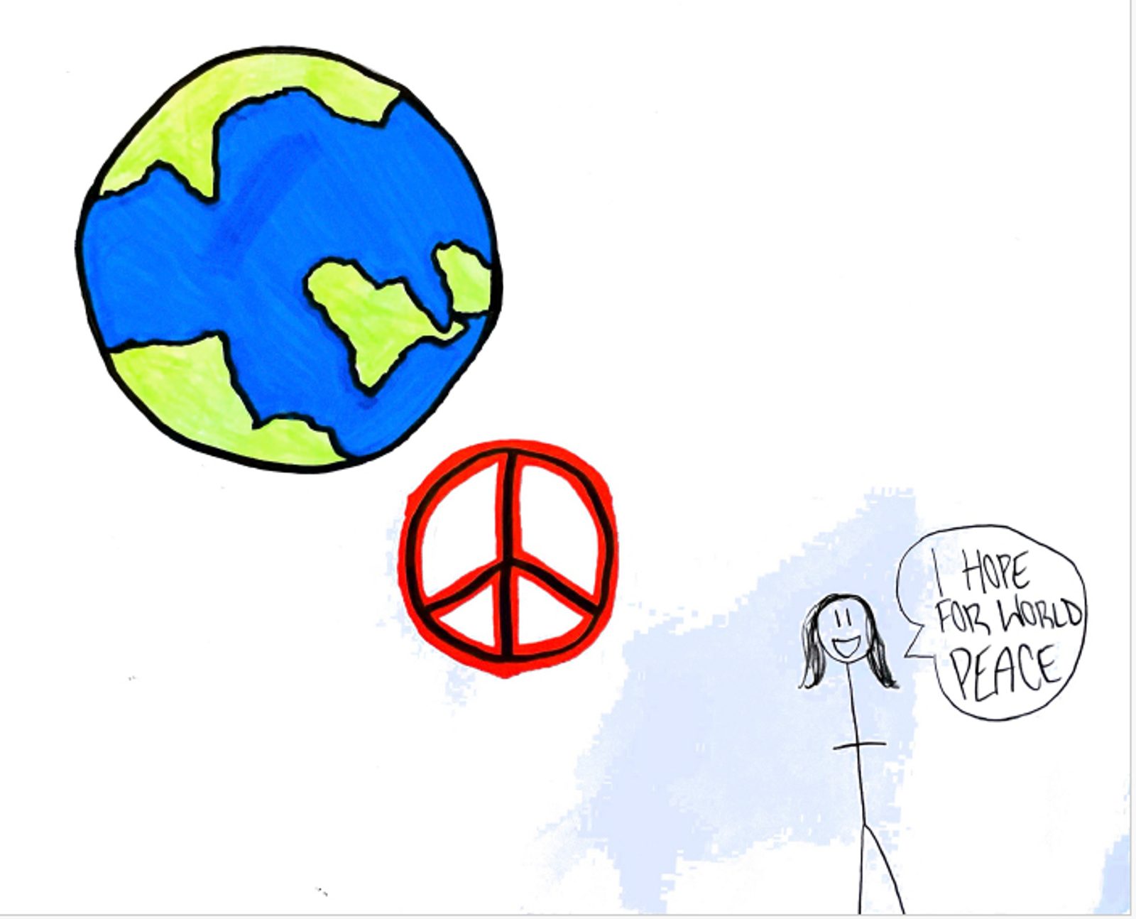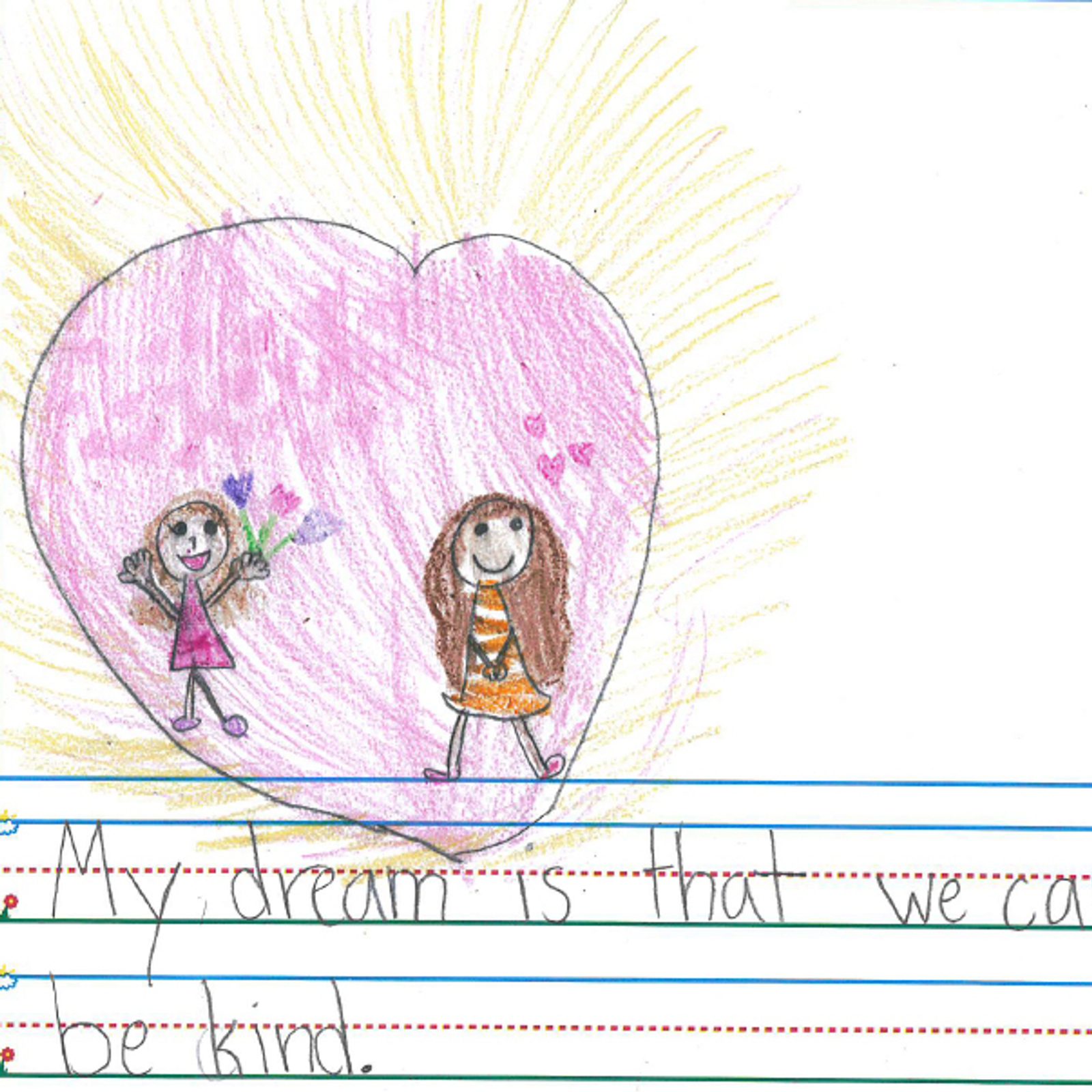“My dream is world peace. I don’t like wars; nobody does. War brings sadness, death, and it destroys. World peace on the other hand brings peace, and you don’t have to worry about fighting one another…” – Artwork and writing by Kellen Holmes, sixth grade, Little Flower School, Great Miils