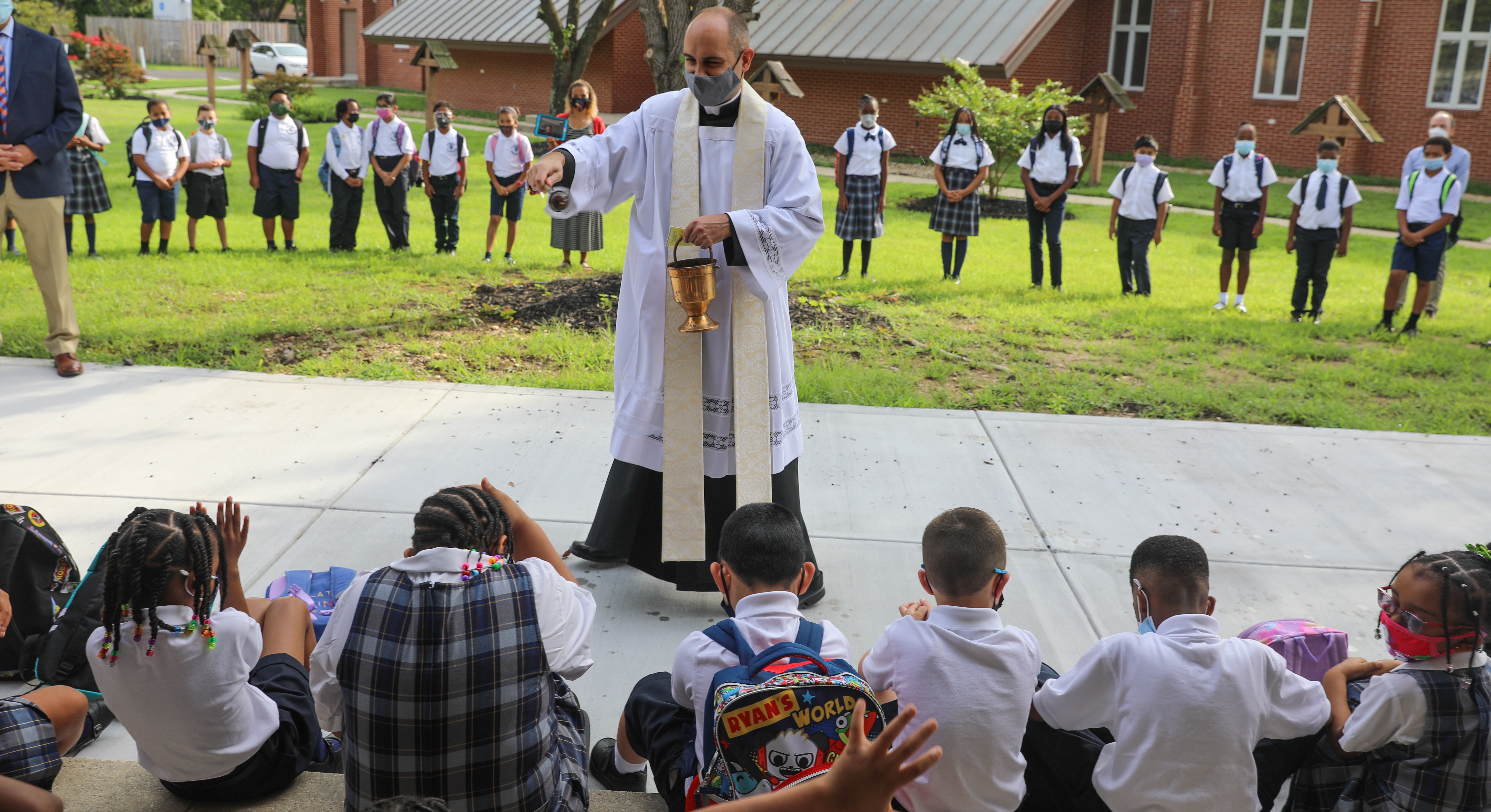 The day began with the students assembling outside the school in Clinton, Maryland, with Father Samuel Plummer, St. Mary’s pastor, saying a prayer and sprinkling holy water on younger students seated together on a walkway and older students standing side-by-side in the yard, for the school’s traditional “Backpack Blessing” inaugurating the new school year.