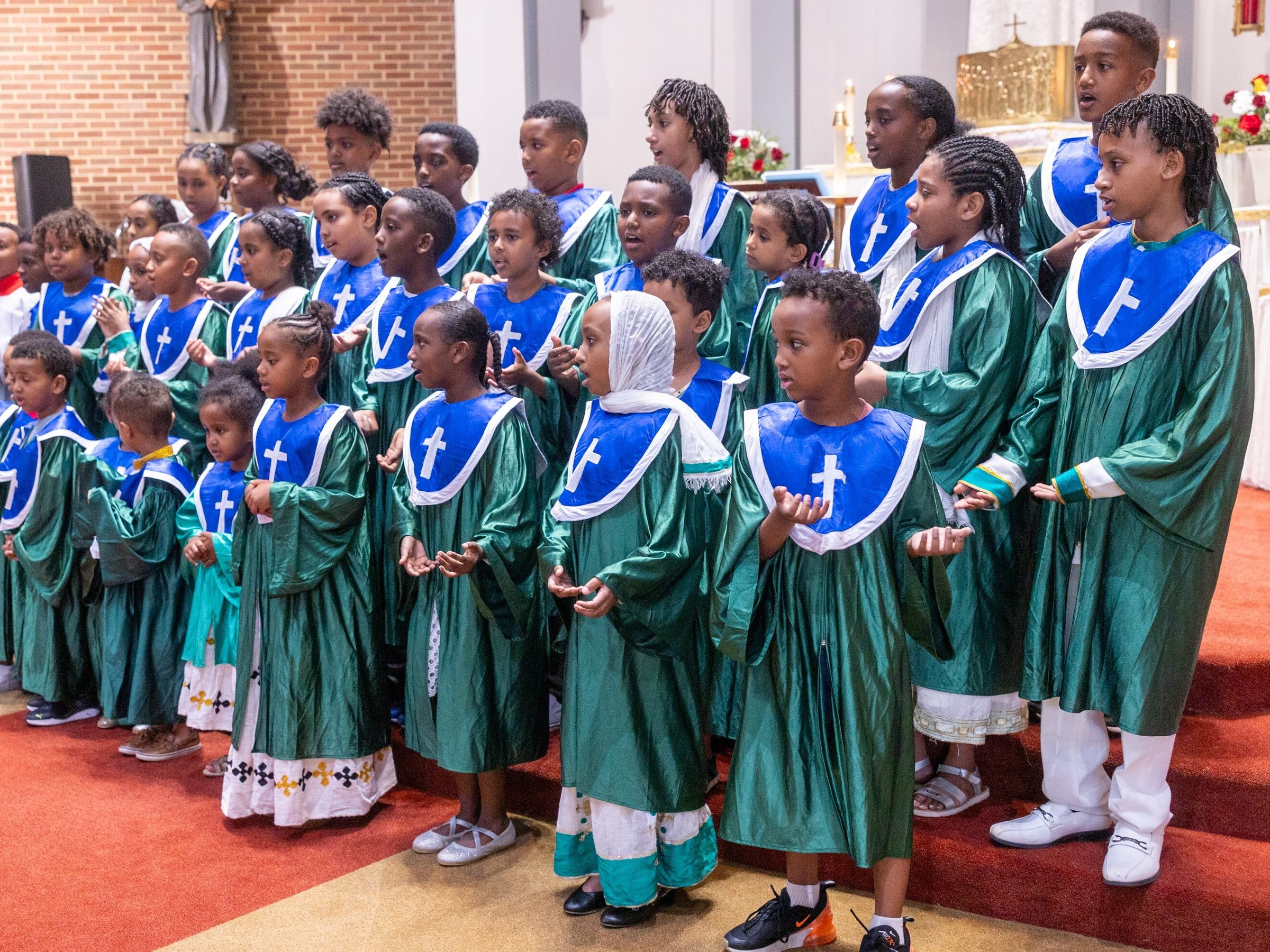The congregation – including women wearing traditional Ethiopian scarves and long cotton dresses – filled the church. An adult choir led the singing, and a youth choir with about 40 children sang songs honoring Mary.